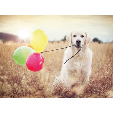 A charming portrait of a creamy-coloured Golden Retriever posing with a bunch of balloons. This handsome chap sits in a field of pale golden oats, and beyond we see the pale tones of an early evening sky. A perfect dog gift (but not for dogs obviously).