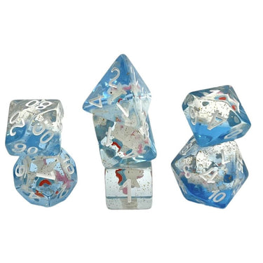 7-piece polyhedral RPG dice set consisting of the typical and relevant RPG dice: D4, D6, D8, D10 (0-9), D10 (00-90), D12 and D20.
