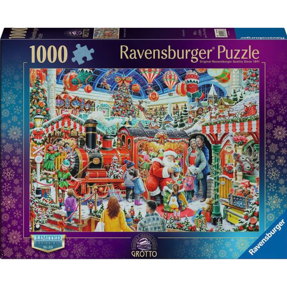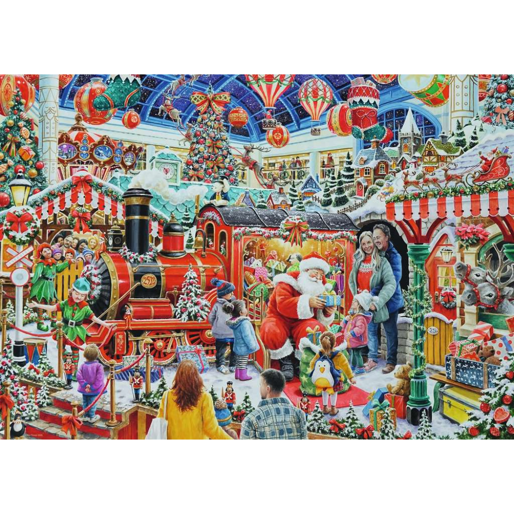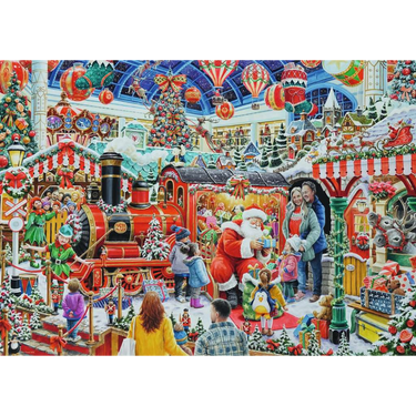 Step into a magical Christmas scene with this exclusive 1000-piece limited edition jigsaw puzzle. Featuring a stunningly detailed festive illustration, Santa sits in his enchanting grotto, with his majestic steam train behind him and two of his faithful reindeer by his side. The scene is set within a luxurious shopping centre, beautifully adorned with twinkling lights, garlands, and vibrant decorations. Excited children and families eagerly wait their turn to meet Santa and share their Christmas wishes, while shoppers bustle around, soaking in the festive atmosphere.