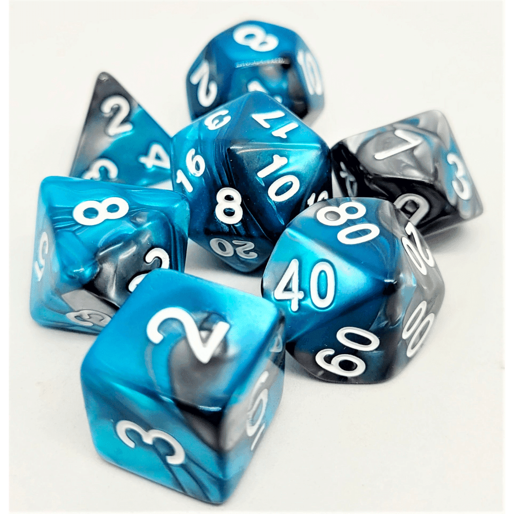 7-piece polyhedral RPG dice set consisting of the typical and relevant RPG dice: D4, D6, D8, D10 (0-9), D10 (00-90), D12 and D20.