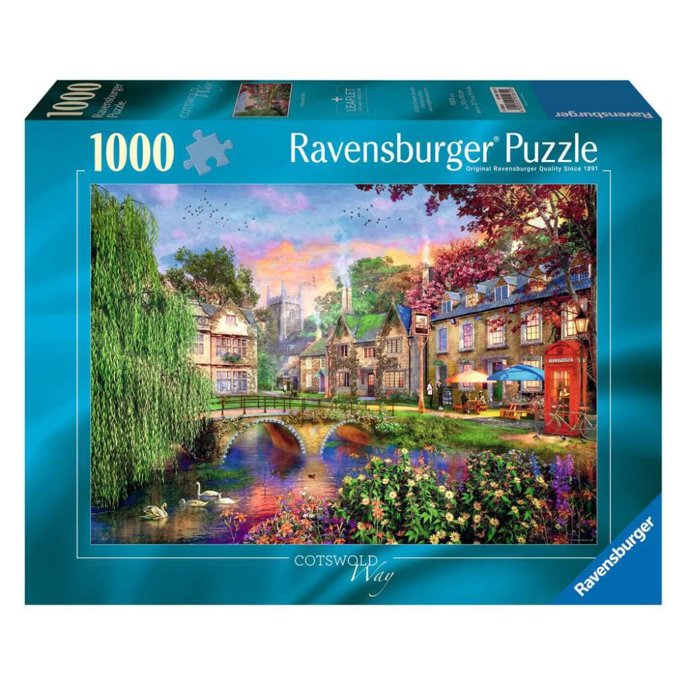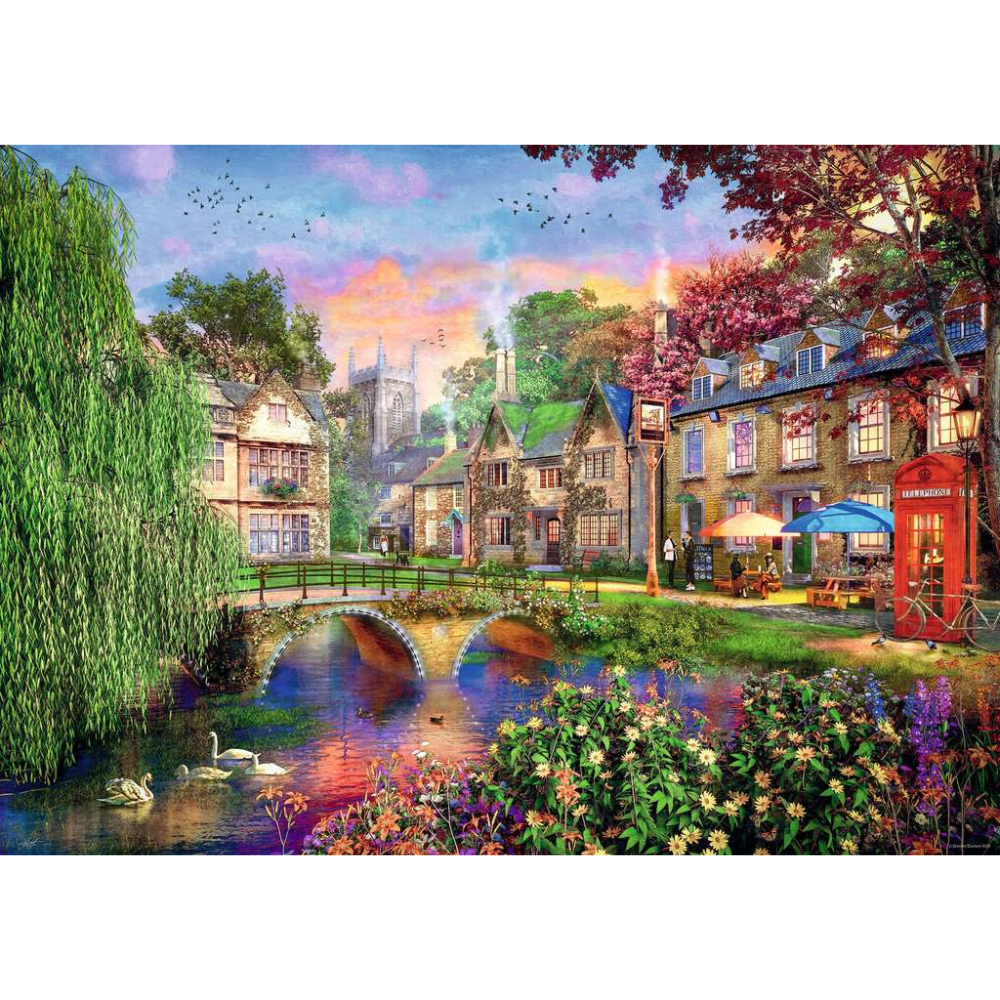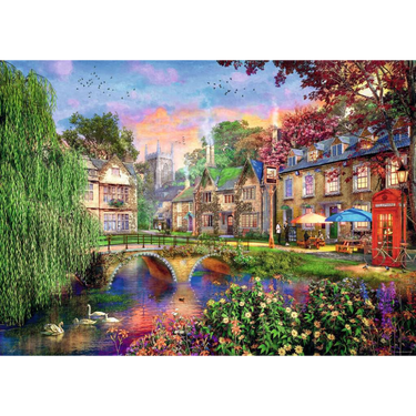 Immerse yourself in the tranquil beauty of a scene straight out of a postcard: a serene lake adorned with graceful swans gliding gracefully passed the arched bridge. In the foreground, a vibrant red telephone box stands proudly, whimsically doubling as a bike stand. Nearby, a couple sits beneath a quaint umbrella outside a cozy pub, enjoying a leisurely moment. As your gaze drifts further, you'll marvel at the Cotswold houses, their stone walls exuding warmth and character against the lush greenery. And in the distance, a church reaches towards the sky, a silent sentinel overseeing the idyllic scene. This puzzle invites you to lose yourself in the timeless allure of the Cotswolds.