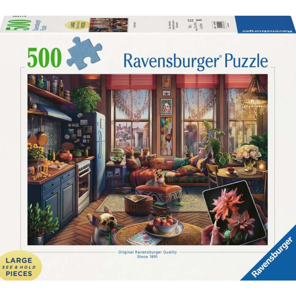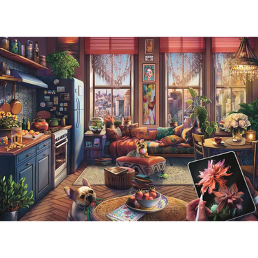 Breathe some free-spirited, creativity into your world as you relax with this “Cozy Boho Studio” puzzle! Imagine yourself in this comfy bohemian artist retreat in the heart of New York City, sipping a lovely cup of tea with refreshing lemon. Baxter is patiently waiting for his walk as soon as you take a break from your digital drawing. Perky Peppa is ready to play keep-away, or join in the jaunt. With large, easy-to-handle pieces and Ravensburger’s famous quality, it’s perfect for a relaxing puzzling session.