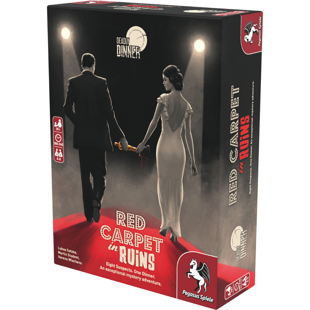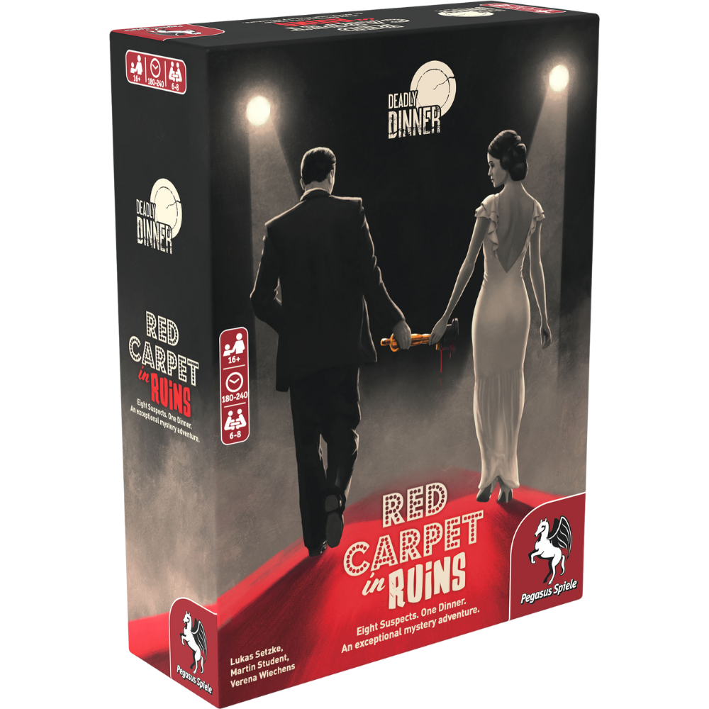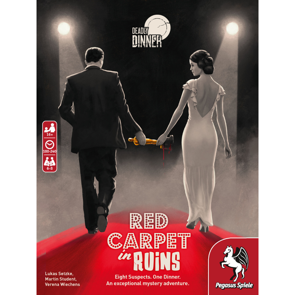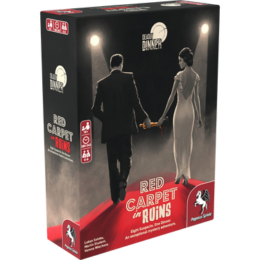 Deadly Dinner – Red Carpet in Ruins is a classical murder mystery game designed for six to eight players. It is played over three rounds, during which the players receive new information about the sequence of events as well as secret objects that can be found in envelopes in the game box. The players have to discuss the information and clues they have available to identify the culprit in the end. A blueprint of the location and character standees allow them to keep track of who was where when the crime occurred.