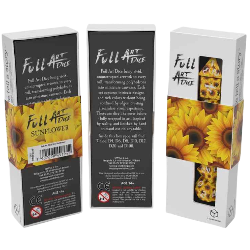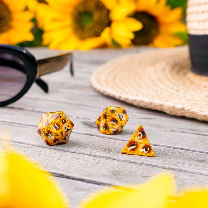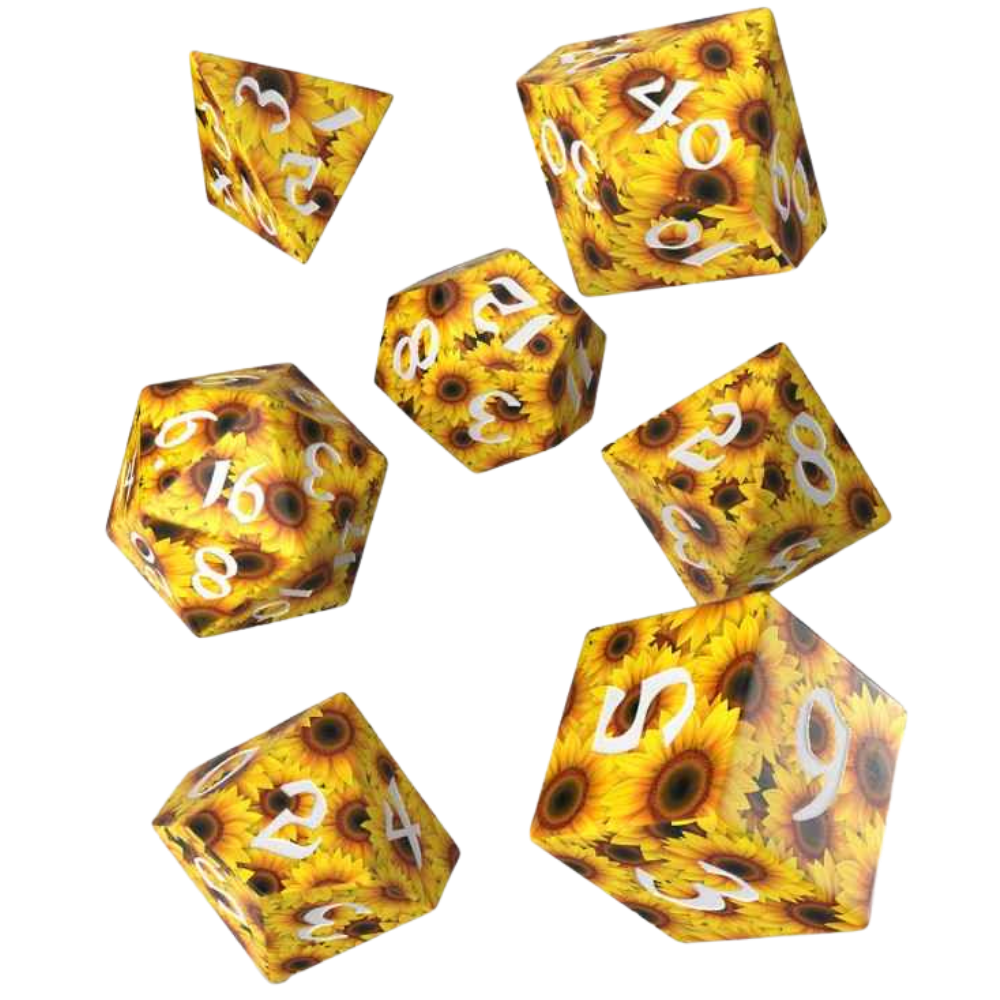 There’s a place where the sun never sets — not because it’s high above, but because it blooms from every surface of the dice. Sunflowers burst to life on each face, their golden petals stretching across corners and edges, forming a continuous field in motion. These aren’t just polyhedrons. They’re sunlit windows into an eternal summer.