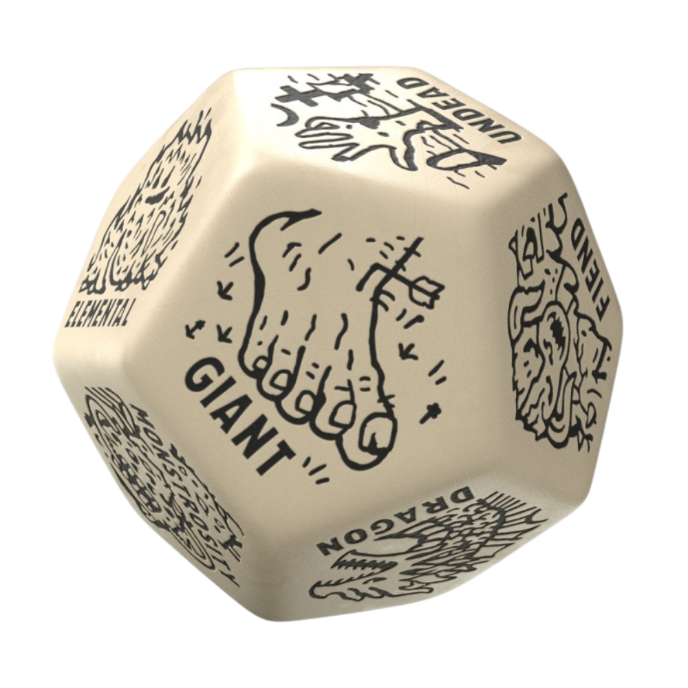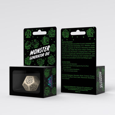 No encounter prepared? We've got you! The Monster Generator Die is a jumbo D12 designed by Viridian Dice, used to conjure a monster on your players' path. Randomisation speaks volumes! Each use summons possibility — from Dragons and Fiends to Oozes and Undead — twelve chances to decide what will stalk the party next.