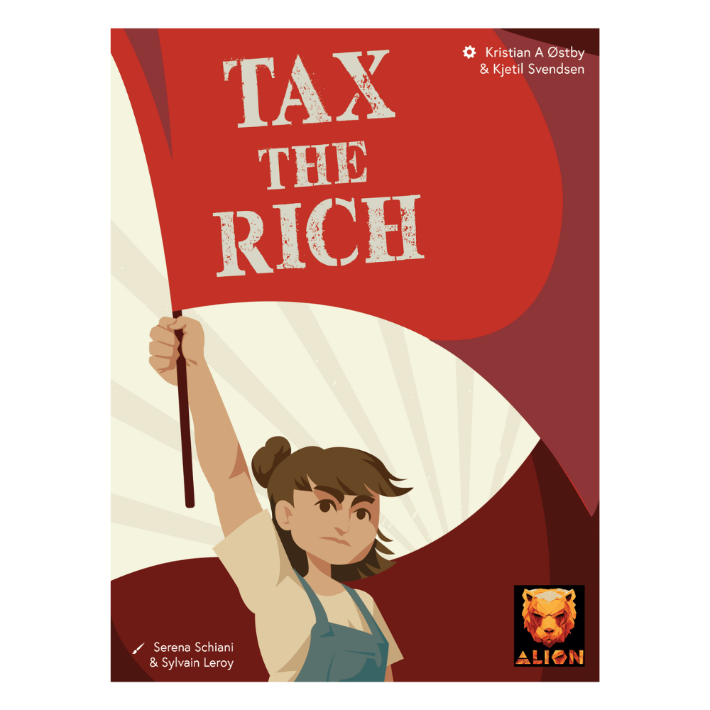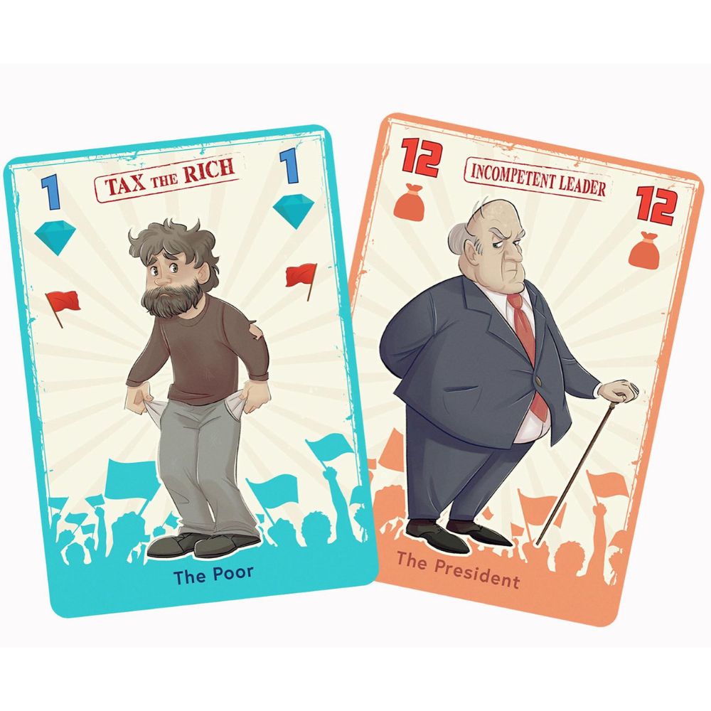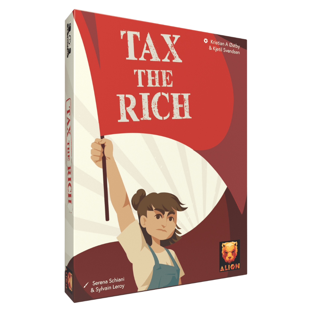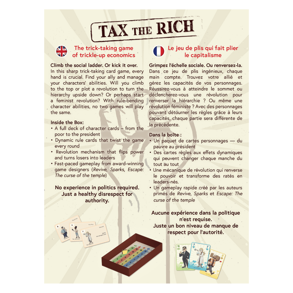 The trick-taking game Tax the Rich features a deck depicting characters of various social ranks from the Poor to the President. Each round begins with a simple bidding phase to determine both the trump color and the number of tricks required to score bonus points. The winner of the bid must then acquire the required number of tricks, together with their ally.