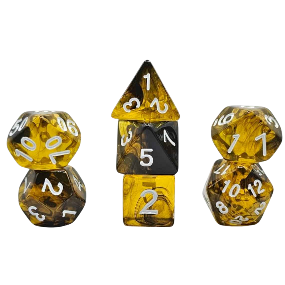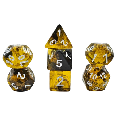 7-piece polyhedral RPG dice set consisting of the typical and relevant RPG dice: D4, D6, D8, D10 (0-9), D10 (00-90), D12 and D20.