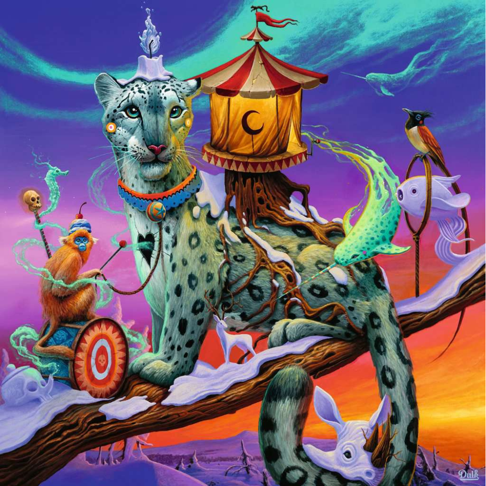 A snow leopard perches on a tree limb, carrying a tent on its back. A golden snub-nosed monkey drums nearby, while fish swim through the air. Birds perch and ethereal creatures float by. The magical twilight blends dawn and dusk.
