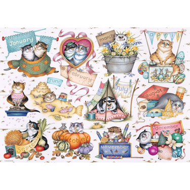 From January to December, witness the hilarious escapades of these lovable furballs as they navigate the ups and downs of cat life in this 1000 piece jigsaw puzzle. Whether they're causing chaos with the fireworks, snoozing on a sun-drenched beach, or getting into mischief with balls of yarn, these whimsical kitties are sure to bring a smile to your face with their boundless energy and irrepressible charm. So gather your favourite feline aficionados, clear a space on the table, and get ready to embark on a purr-fectly delightful adventure through a world where every day is a cat-tastic celebration!
