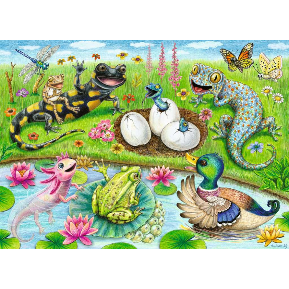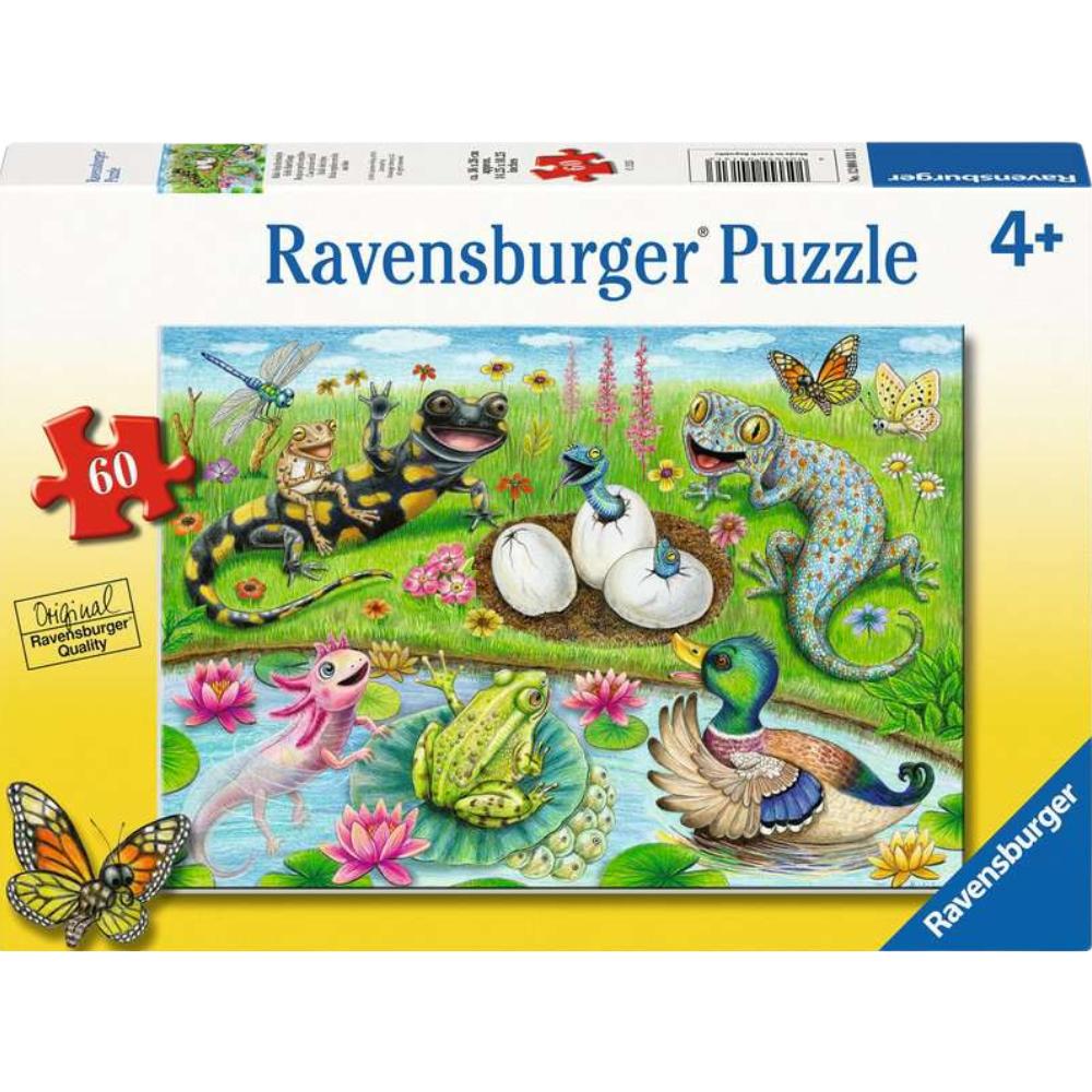 Explore the magical world of new beginnings with our 60-piece giant floor jigsaw puzzle featuring "Hatchlings"! This delightful puzzle captures the wonder of baby animals hatching from their eggs, showcasing adorable scenes of baby reptiles and a cute little duck