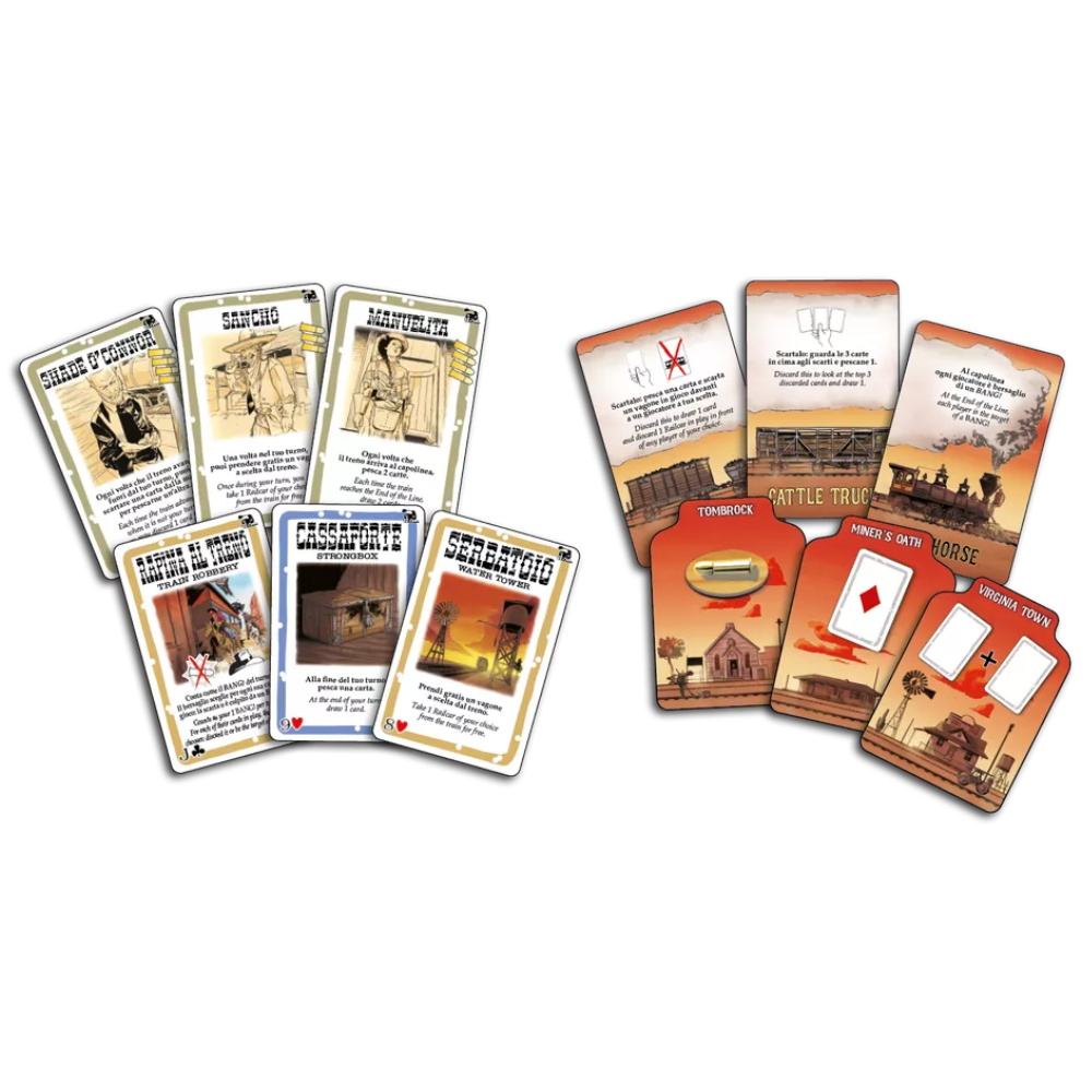 The expansion focuses on a track of Railroad cards and a Locomotive card: Each Railroad card is coupled with a Station tile; every time the Sheriff’s turn begins, the train moves and the value of the Railroad cards change depending on the Station tiles. Once during their turn, players may pay the cost shown on a Station to take the corresponding Wagon. There are two kinds of Railcars: blue-bordered Railcards stay in play until discarded, and take effect immediately; while green-bordered Railcars stay in play but have no effect until the owner decides to discard them during their turn. If a Railcar is taken, the other Railcars on the train slide up to cover the gap, and a new one is added to the end of the train. As soon as the first Railcar behind the Locomotive goes past the last Station, the Locomotive card’s special effect triggers for all players. Then a new track of 5 Station tiles, as well as a new train, is built in the centre of the table.