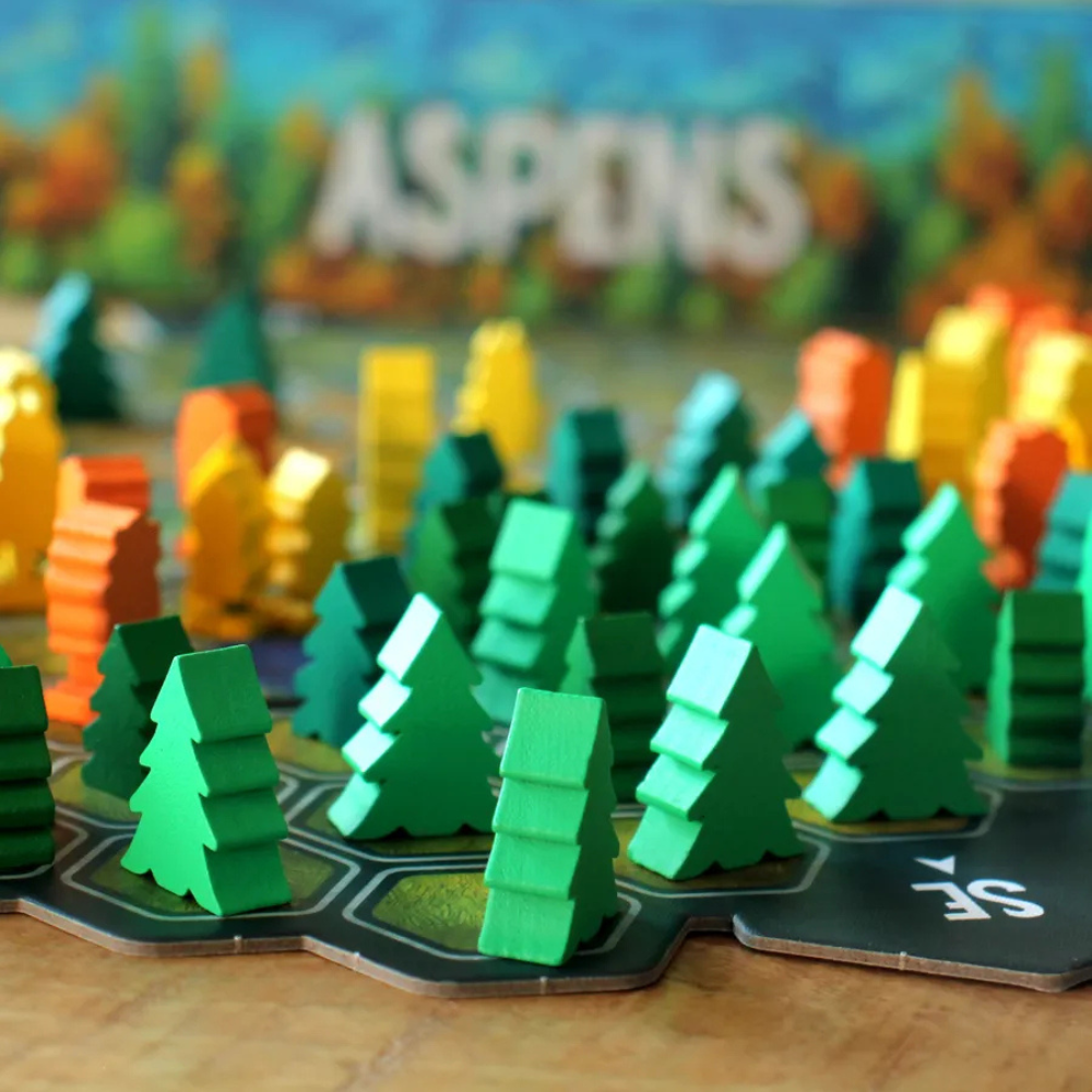 In Aspens, players compete to grow the largest forest on a shared board - having to balance how much they invest in building their "engine" to increase the odds of generating trees on future turns, with the pressure of needing to expand to claim territory and ultimately be crowned the winner.