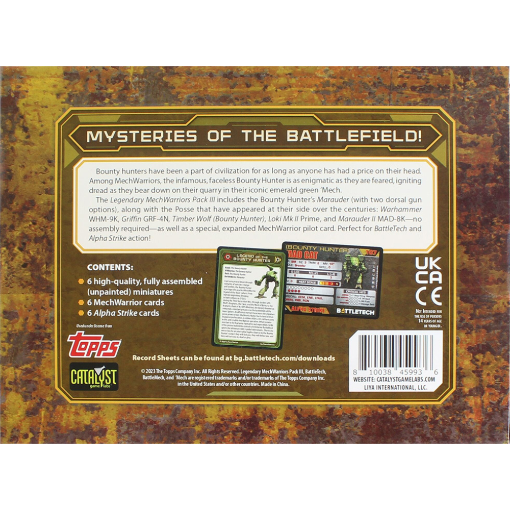 The Legendary MechWarriors Pack III includes the Bounty Hunter's Marauder (with two dorsal gun options) along with the Posse that has appeared at their side over the centuries. Warhammer WHM-9K, Griffin GRF-2N, Timber Wolf (Bounty Hunter), Loki Mk II Prime and Marauder II MAD-8K—no assembly required—along with a special expanded MechWarrior pilot card. Perfect for BattleTech and Alpha Strike action!