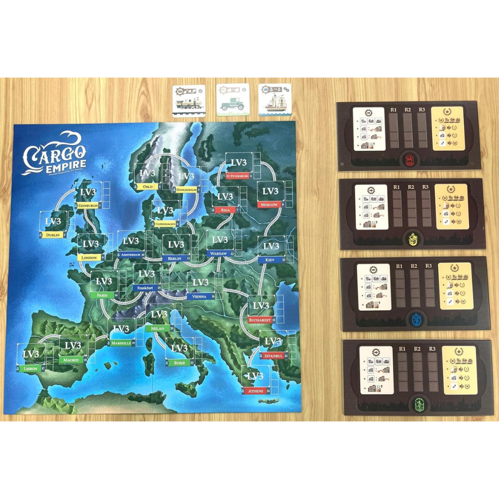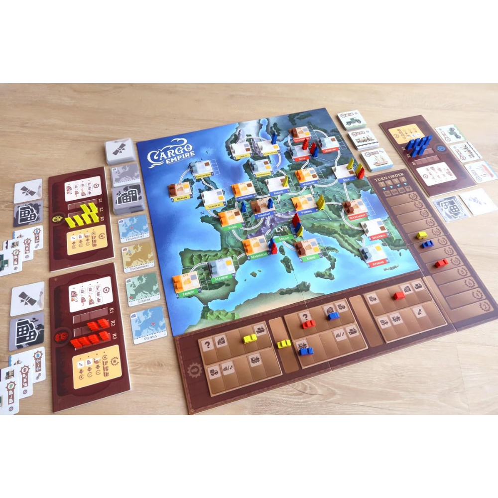 Cargo Empire is a pick-up-and-deliver board game with point-to-point network building. Players immerse themselves in a complex world of transportation networks, striving for glory, wealth, and power as leaders of one of the four major families on the continent of Dyorle.