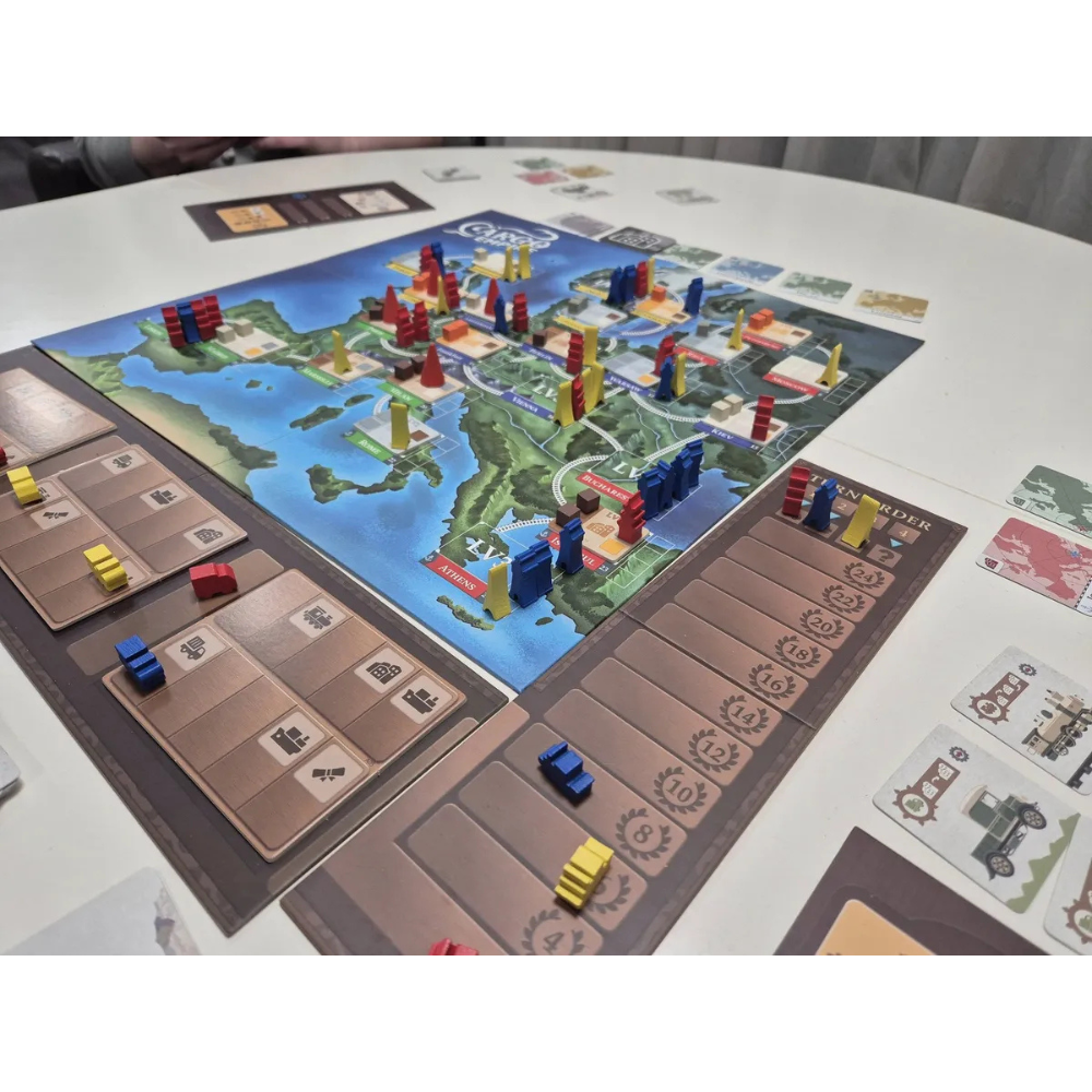 There is only one action in this game, and that is transporting cargo. Players must navigate a changing landscape, weaving between cities and using various transport modes to score points. To dominate, players must plan their network of trading posts meticulously and keep a sharp eye on long-term rewards.