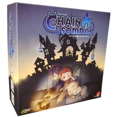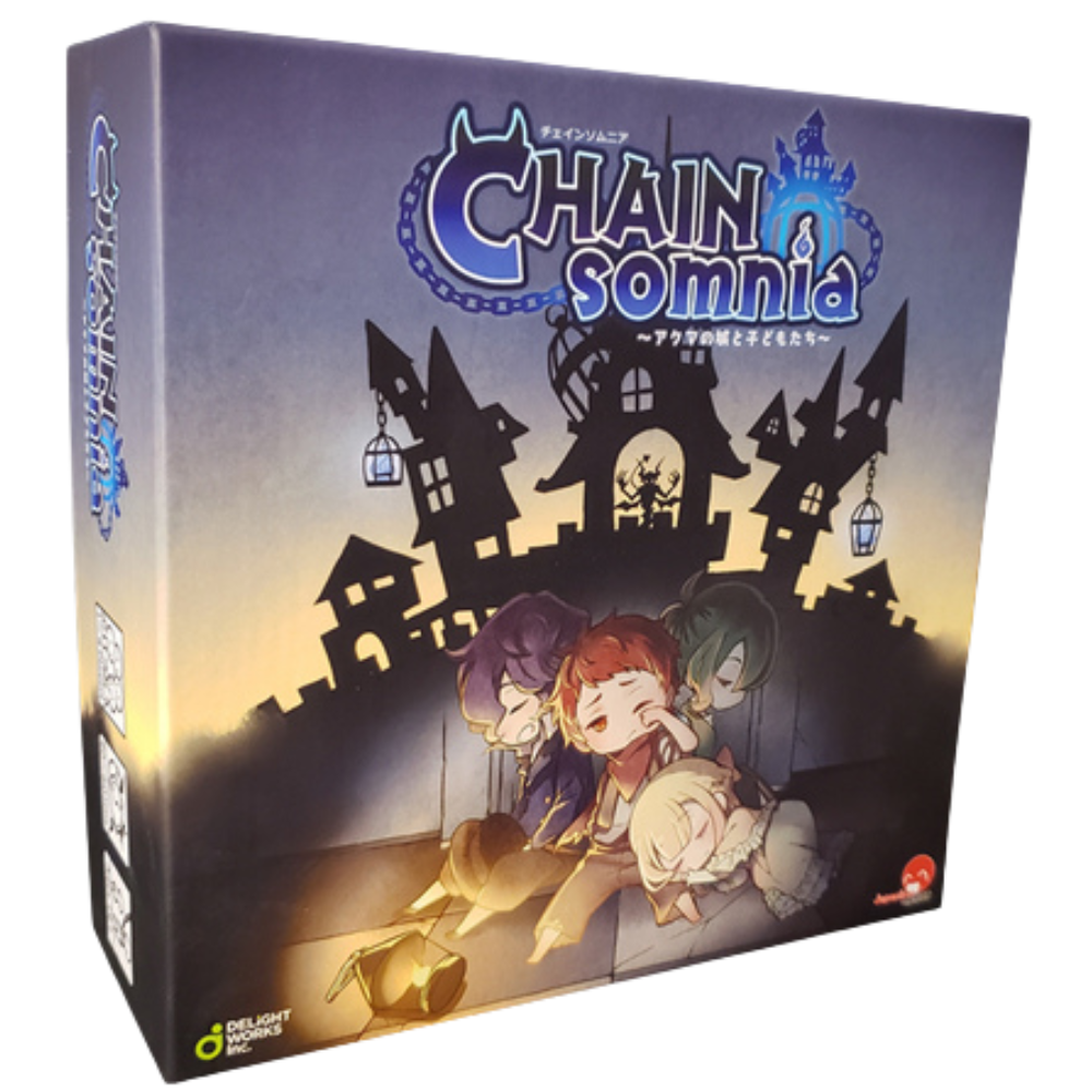 In CHAINsomnia sleeping children become trapped in the castle of the demon Akuma and must work with others to escape. If any player is on the "wake up" tile when all "bad dream" cards are removed, they escape and win the game; if all the characters are immobilized by chains or the event cards are exhausted without anyone waking up, then everyone is defeated.