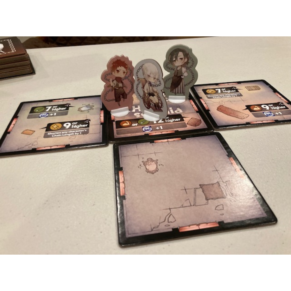 In more detail, you and each other player take a character card and cover two of the six spaces on its "chain gauge". The highest uncovered number on this gauge shows how many action points (AP) you have available on your turn, and each character has a unique skill, in addition to values for strength, wisdom, and luck. All characters start on the central tile, with the "wake up" tile being placed at the bottom of the room tile deck. On a turn, you use your AP to take actions from the following list, repeating actions as desired: