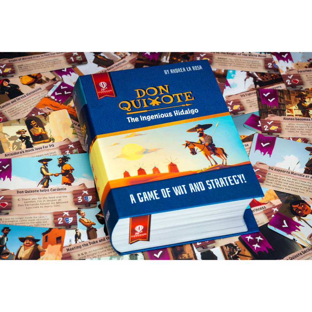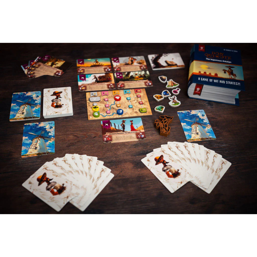 Based on the famous novel from Miguel de Cervantes, Don Quixote is a fast game of wit and strategy. Discover how Alonso Quijano became Don Quixote, how he asked a tavern host to make him a knight, the famous encounter with windmills turning into giants, his quest for Dulcinea's love and many more! Throughout the game, you will explore the stories told in the masterpiece that Miguel de Cervantes created. It's a great way to learn about this beautiful work and its message, while having fun.