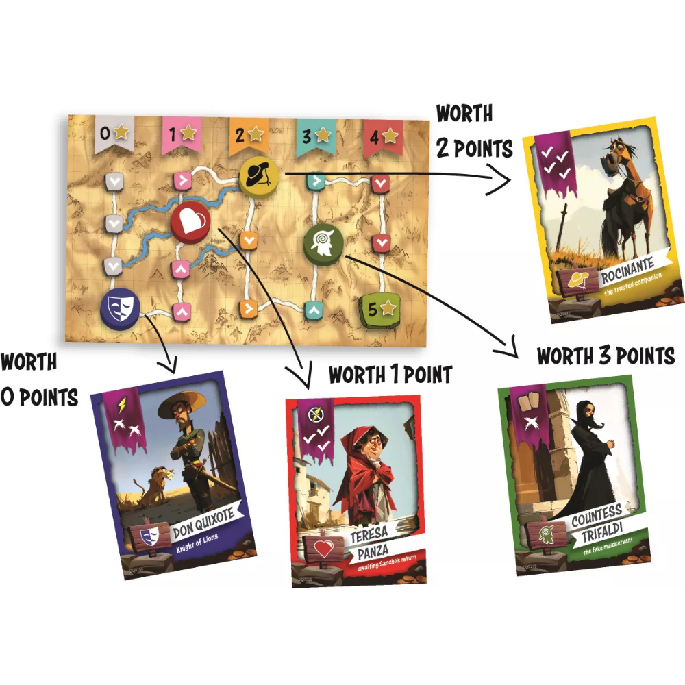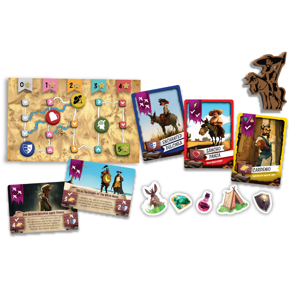 Each round, the ingenious Don Quixote will head for a new adventure, and players vote simultaneously on whether to help him or not. Success in an adventure means Don Quixote progresses on his quest towards glory or love, while failure increases his delusion.