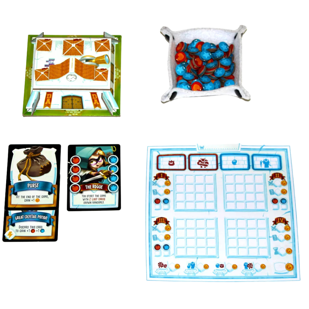 Once everyone has finished drawing a line through the dungeon, you trace out that path step by step, removing life (1 or 2) to defeat red monsters (small or large) and mana (1 or 2) to defeat blue monsters (small or large). You place new tokens on your character as you pass through potions and strength spaces. Once you're through the grid, you score points for the monsters you defeated, and you choose one of four quests on your sheet for bonus points. (In the second round, you choose one of the three remaining quests, so your choices diminish over time.) In player order based on your number card, you take one of the available treasures, which provide points and powers. Your life and mana levels carry over into the next round.