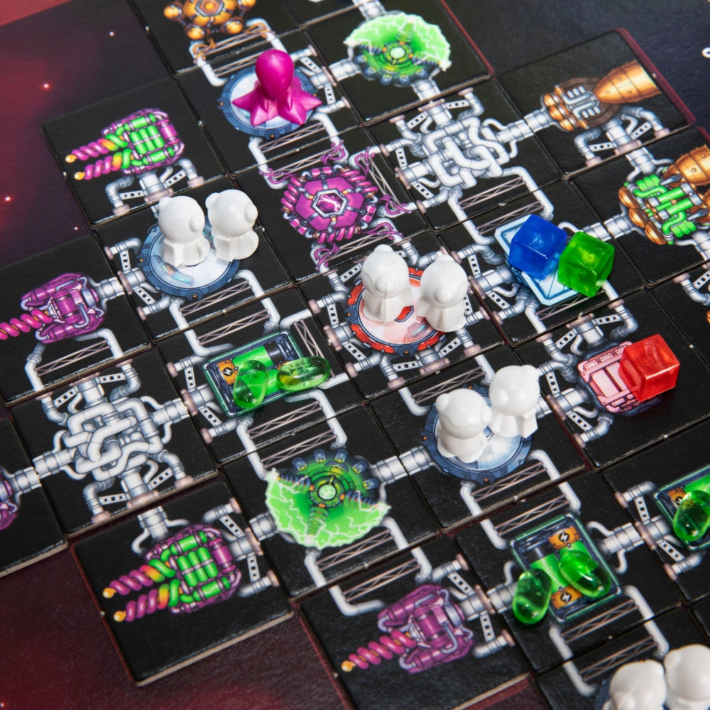 In the fast and goofy family game Galaxy Trucker, players begin by simultaneously rummaging through the common warehouse, frantically trying to grab the most useful component tiles to build their spaceship — all in real-time.