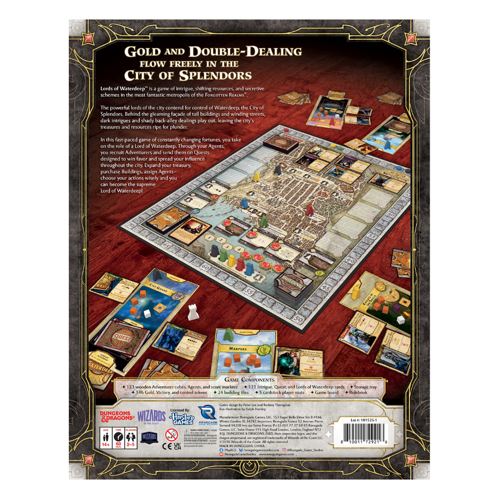 The powerful lords of the city contend for control of Waterdeep, the City of Splendors. Behind the gleaming facade of tall buildings and winding streets, dark intrigues and shady back-alley dealings play out, leaving the city’s treasures and resources ripe for plunder.