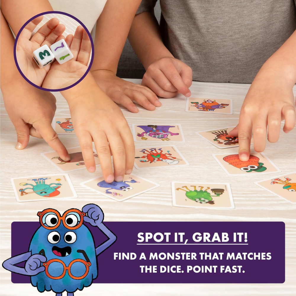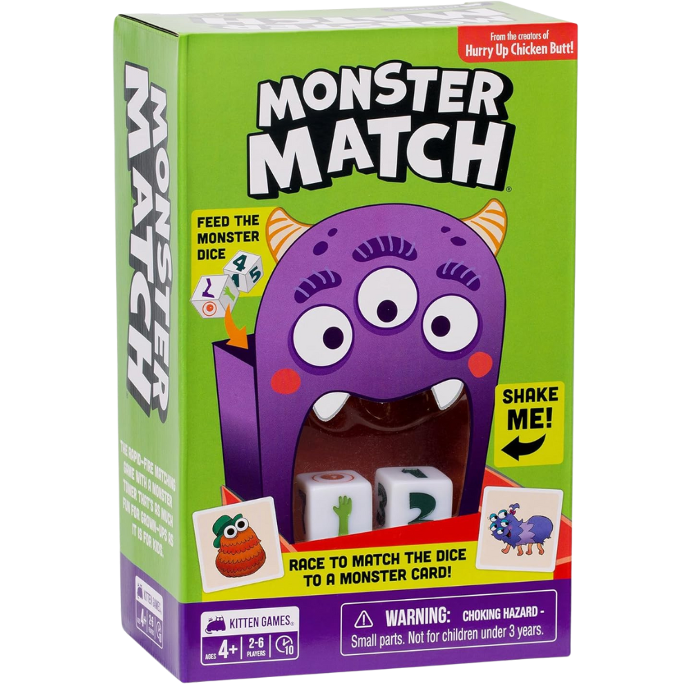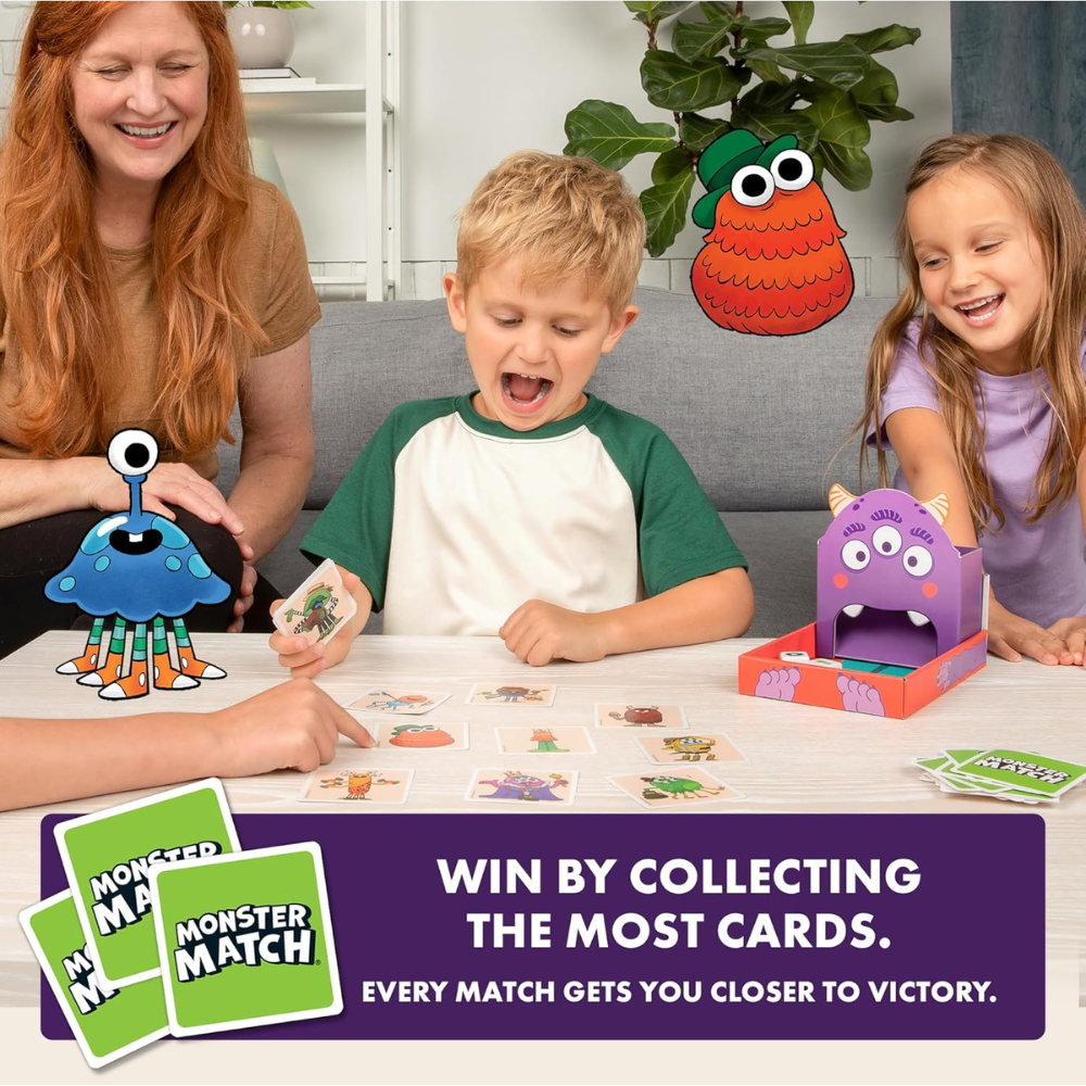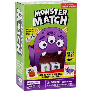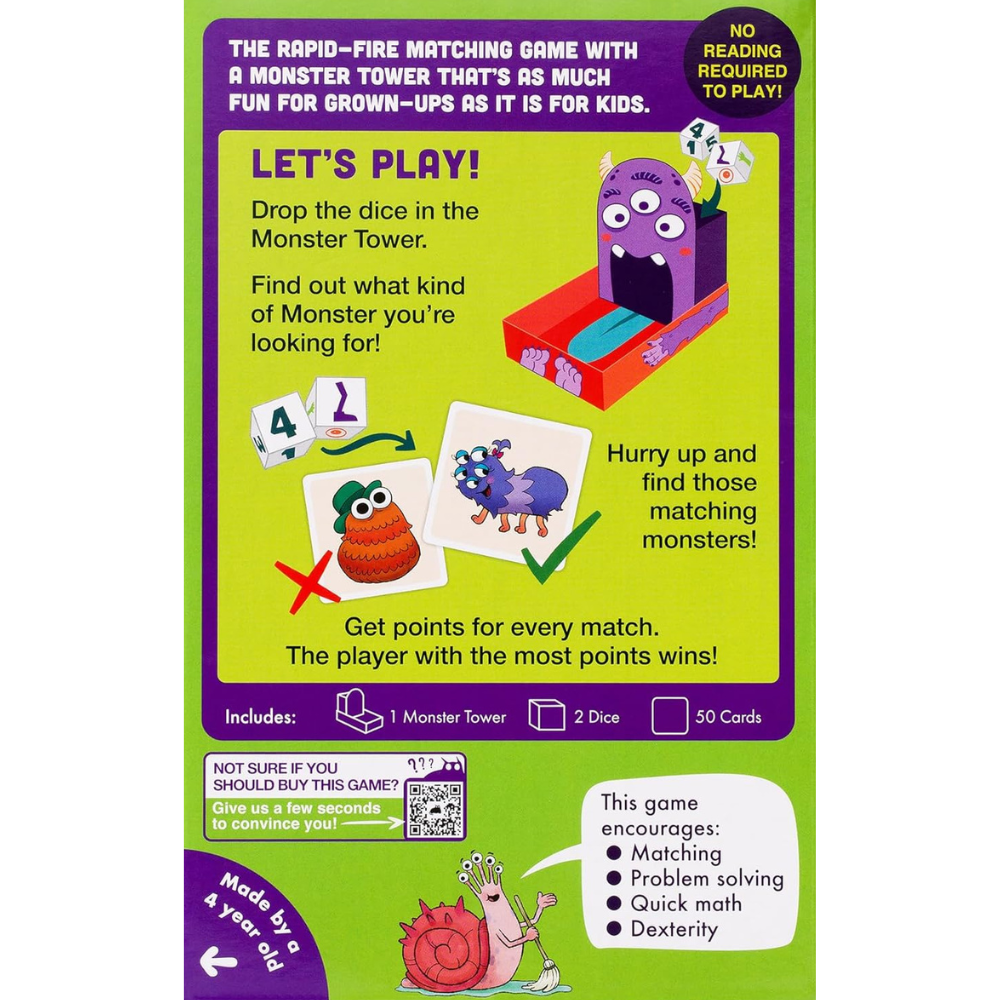 NO MORE BORING KIDS' GAMES: Monster Match is a family game designed to be simple enough for kids and exciting for grown-ups too. Toss the dice in the Monster Tower and race to find a monster card that matches. The person with the most cards wins! It's a matching game made with 4 year olds in mind.