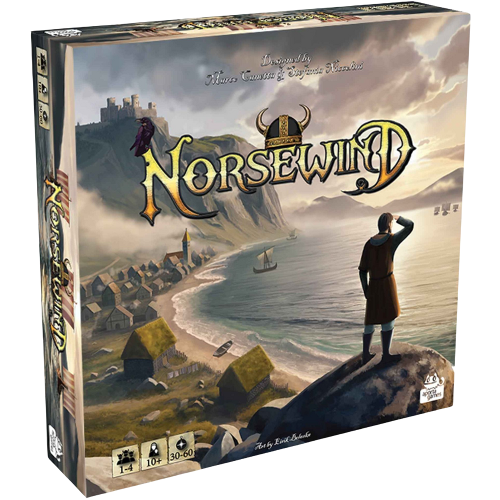 Norsewind is a tableau-building game. Each turn, you pick a card and add it to your growing kingdom, that is, your tableau. Place it cleverly to earn rewards. Gather helpful followers and upgrade your castles because the Vikings are coming, and they are not here to make friends! At the end of the game, you score each row in your tableau but only if your defence is stronger than the power of the Viking attack.