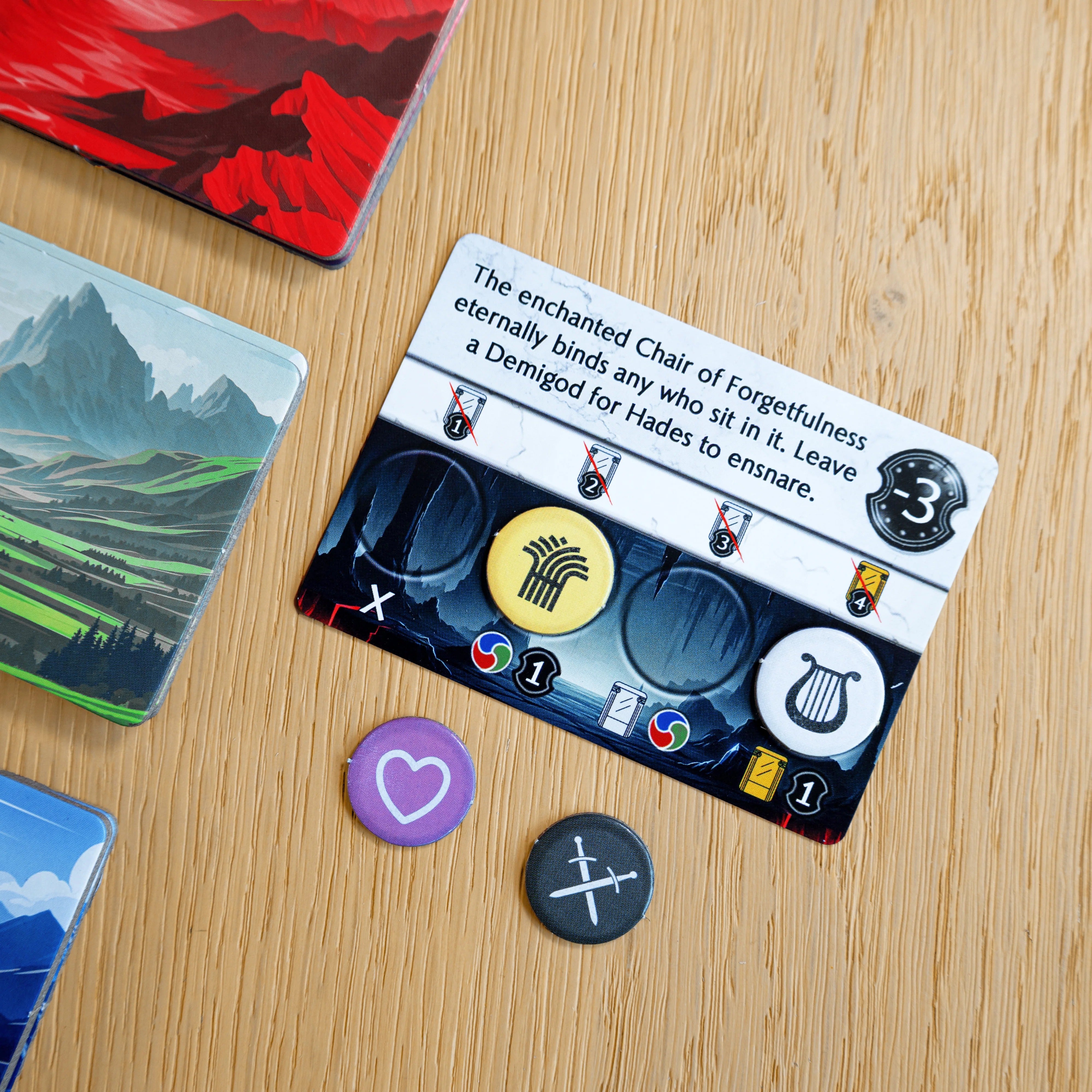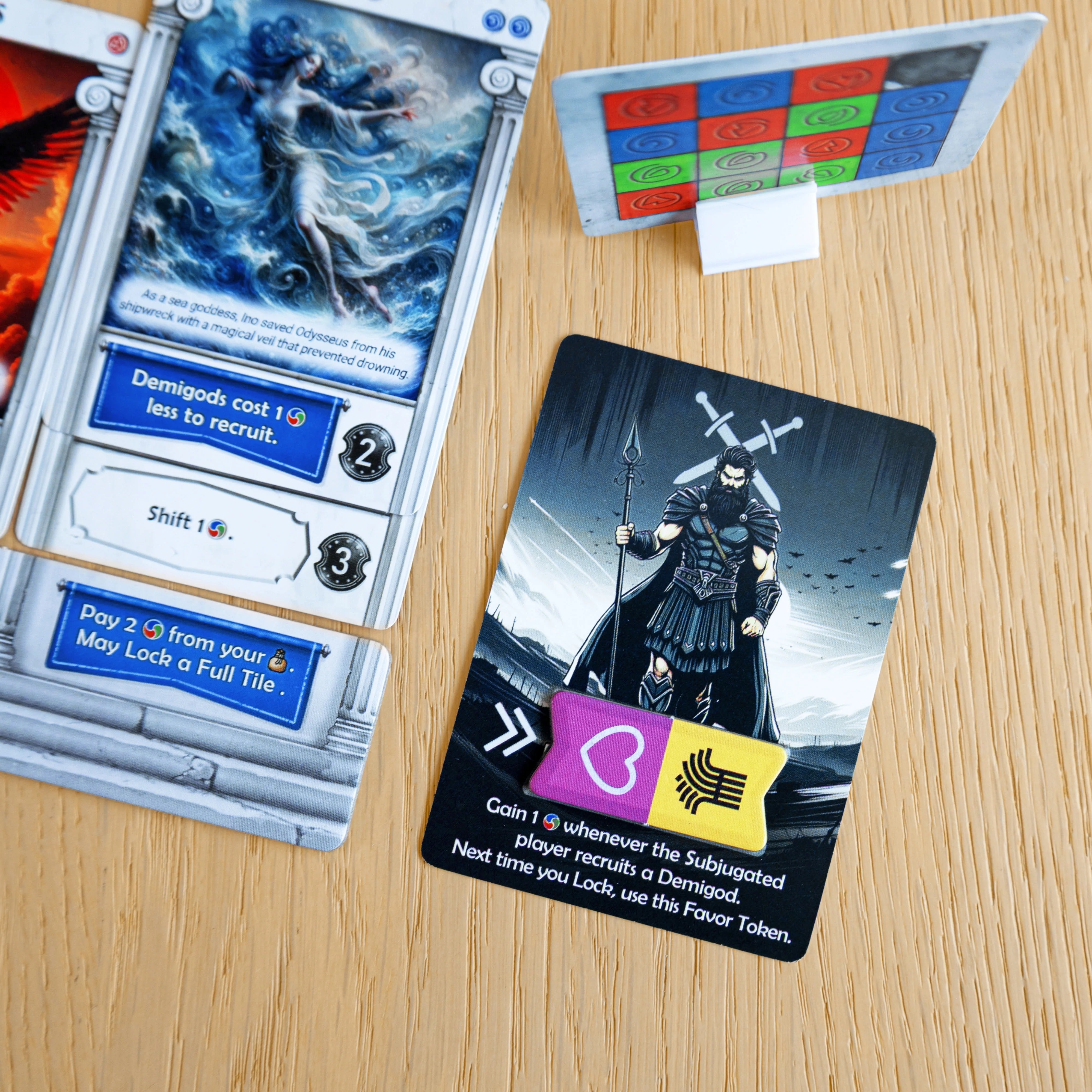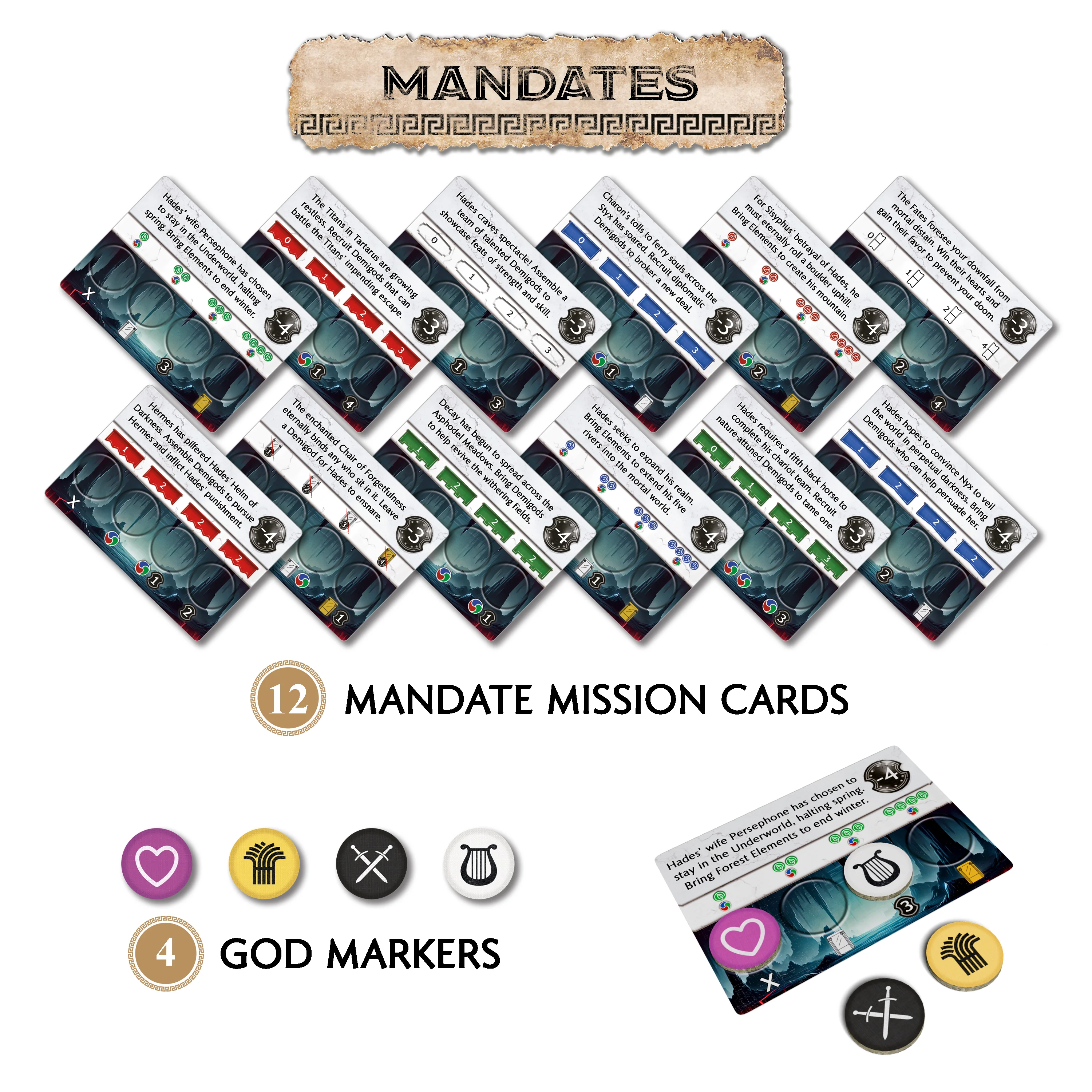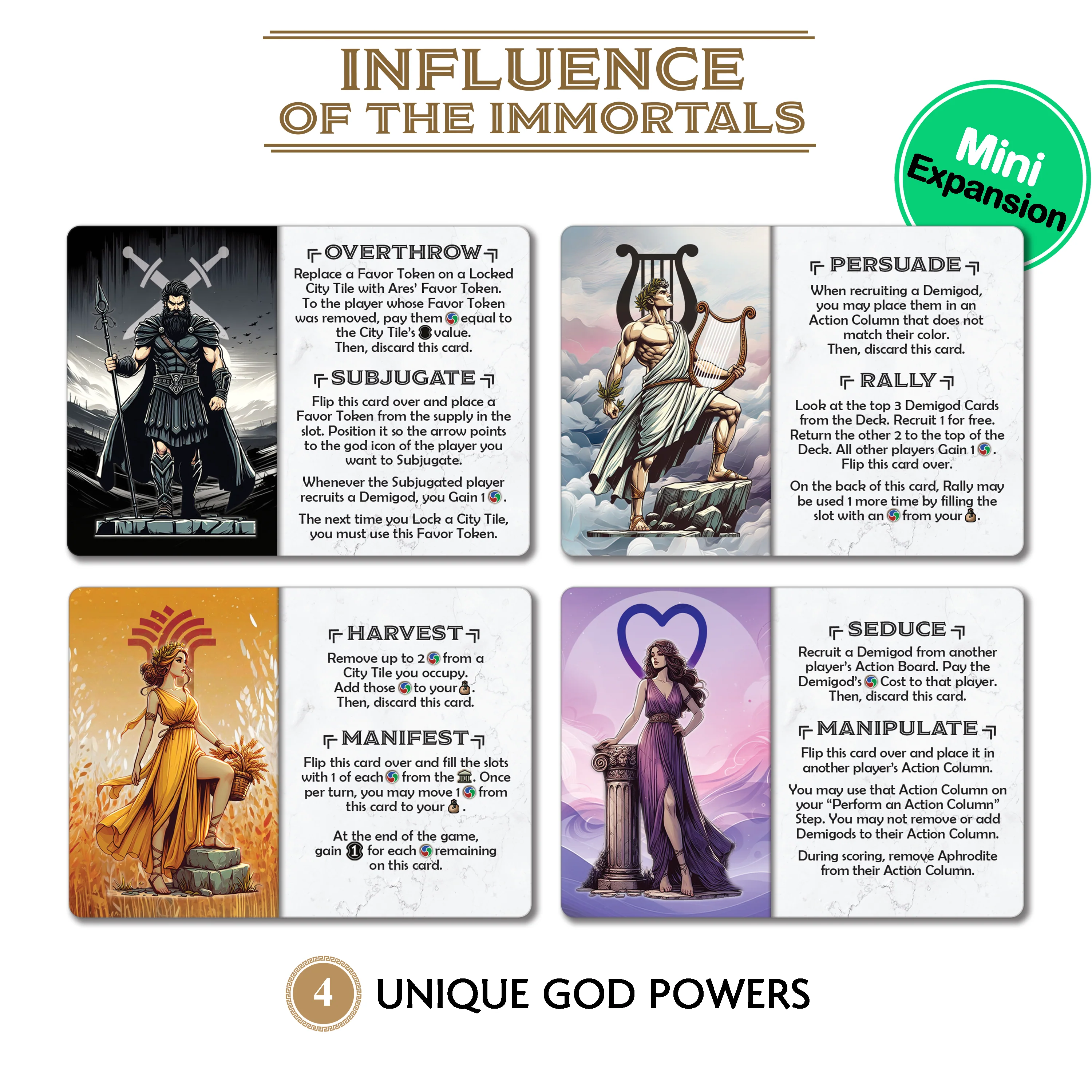 Influence of the Immortals: The gods are ready to directly intervene in the mortal's affairs. This Mini-Expansion grants each player a unique and thematic set of powers, bringing their character to life on the board.