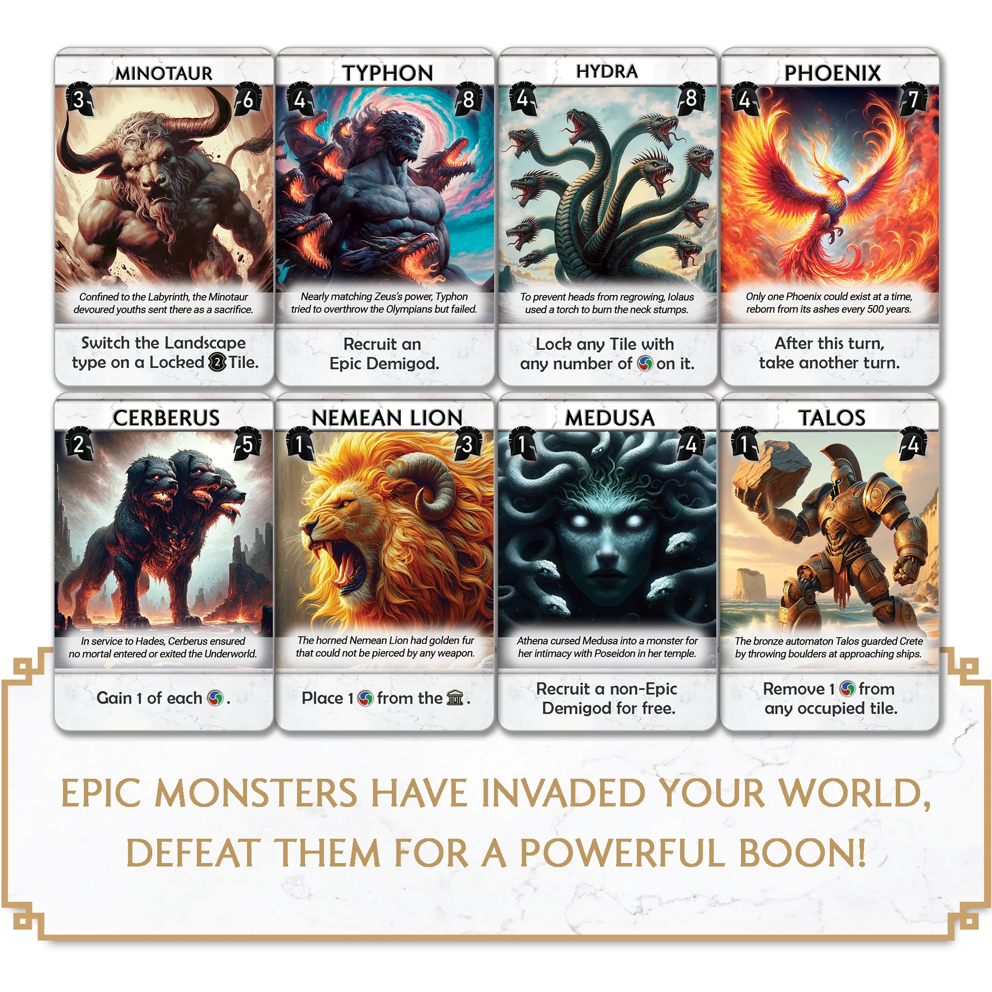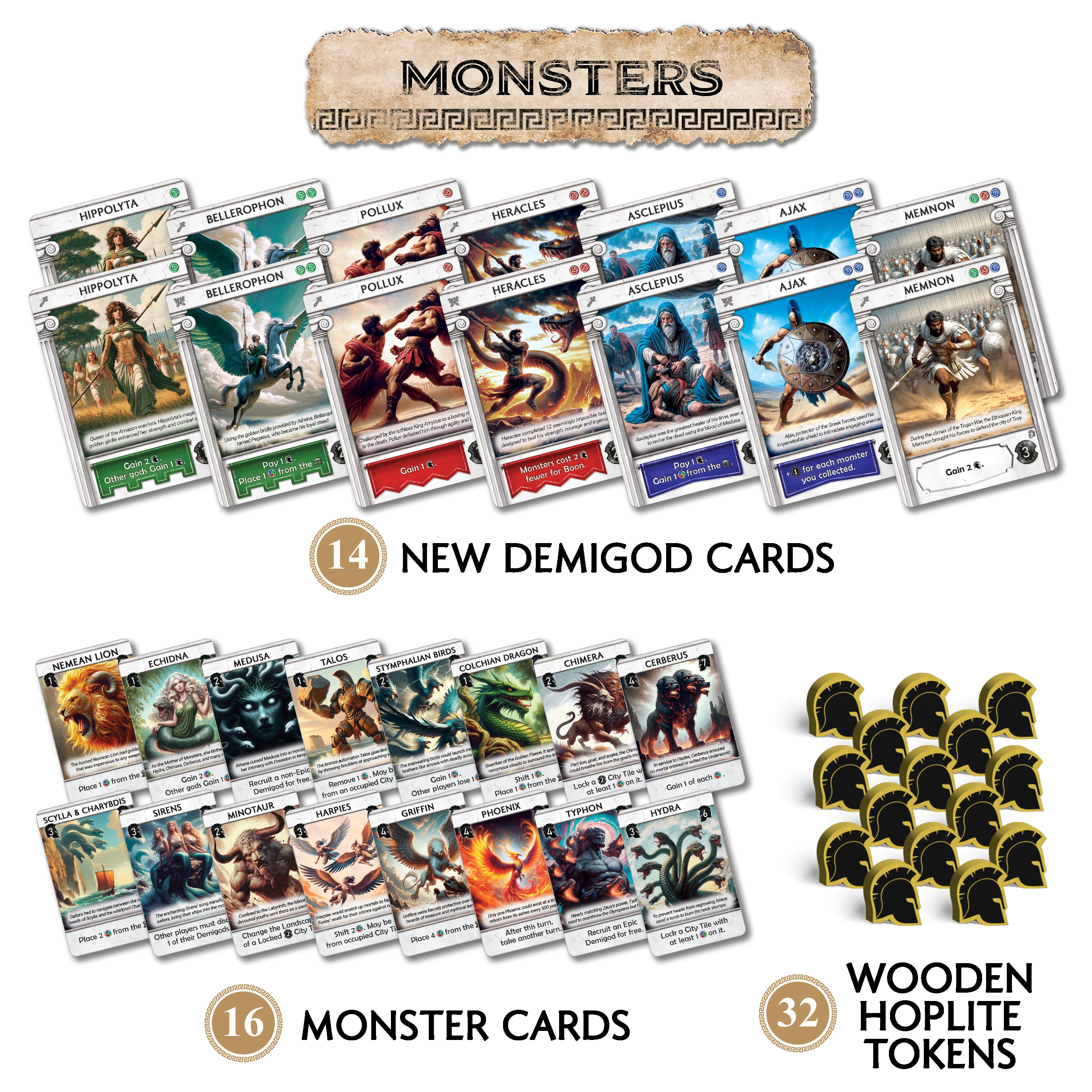 Monsters Expansion: Mythical Monsters have invaded the newly formed landscapes. Use new Demigods to gather an army of Hoplites to drive them off your land, or defeat them for a powerful boon.