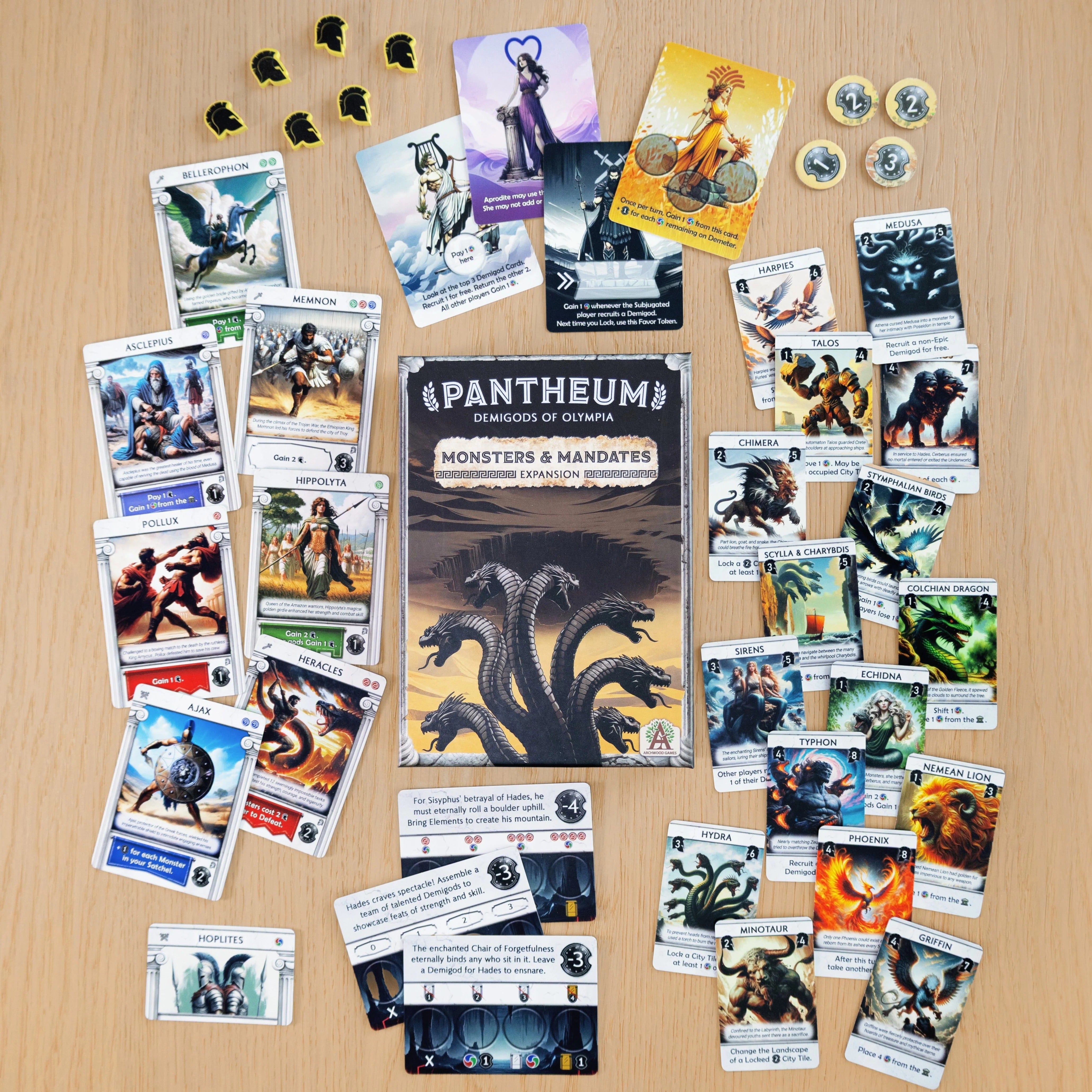 The Monsters and Mandates Expansion includes three standalone expansions that each add unique mechanics to Pantheum. Play them separately or combine them for the ultimate experience!