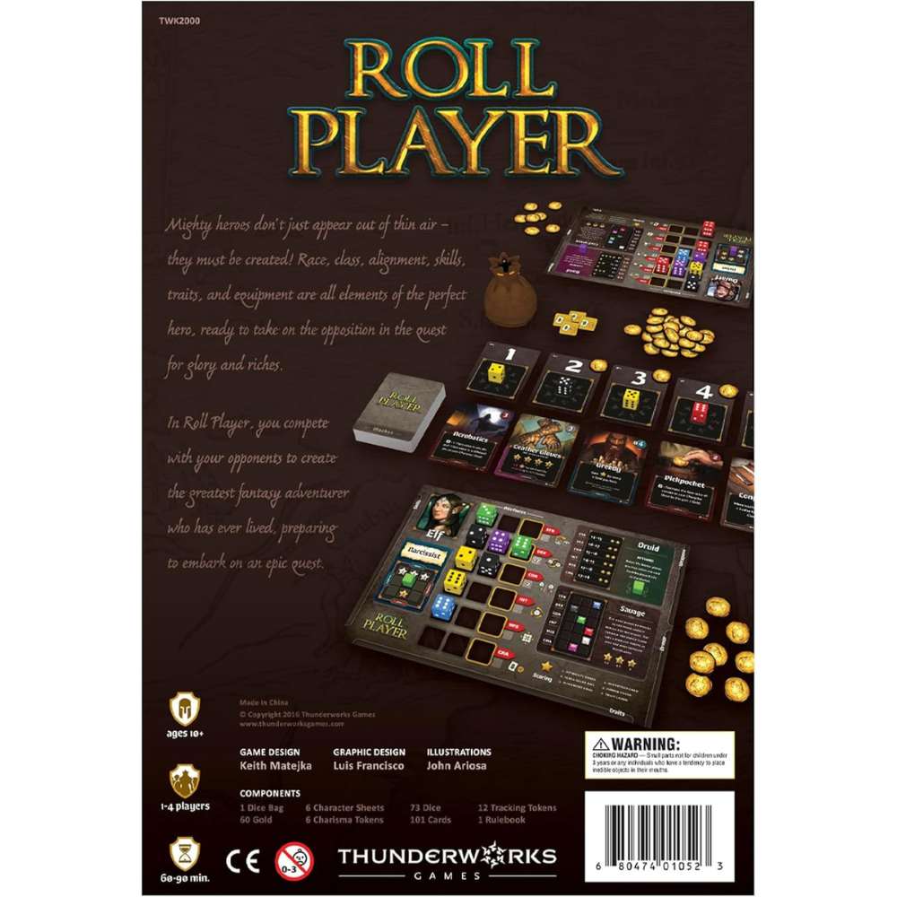In Roll Player, you will compete to create the greatest fantasy adventurer who has ever lived, preparing your character to embark on an epic quest. Roll and draft dice to build up your character’s attributes. Purchase weapons and armor to outfit your hero. Train to gain skills and discover your hero’s traits to prepare them for their journey. Earn Reputation Stars by constructing the perfect character. The player with the greatest Reputation wins the game and will surely triumph over whatever nefarious plot lies ahead!