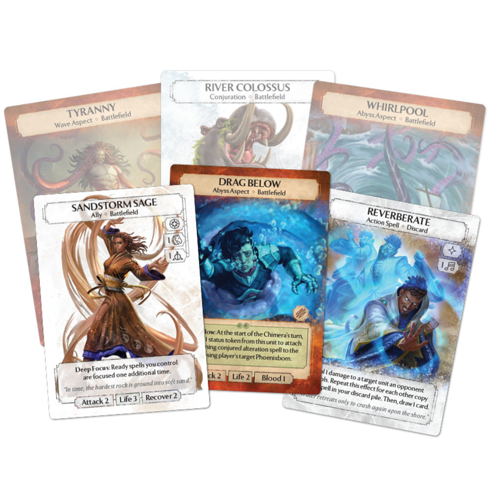 Choose from four returning Phoenixborn: Namine, Echo, Harold, and Fiona, each wielding a brand new signature card. Use the included new sympathy magic player deck to sail out and confront the evil lurking in the water! But keep one eye on the moon, for that celestial body will empower this new abomination, unleashing hideous new attacks upon your embattled Phoenixborn!