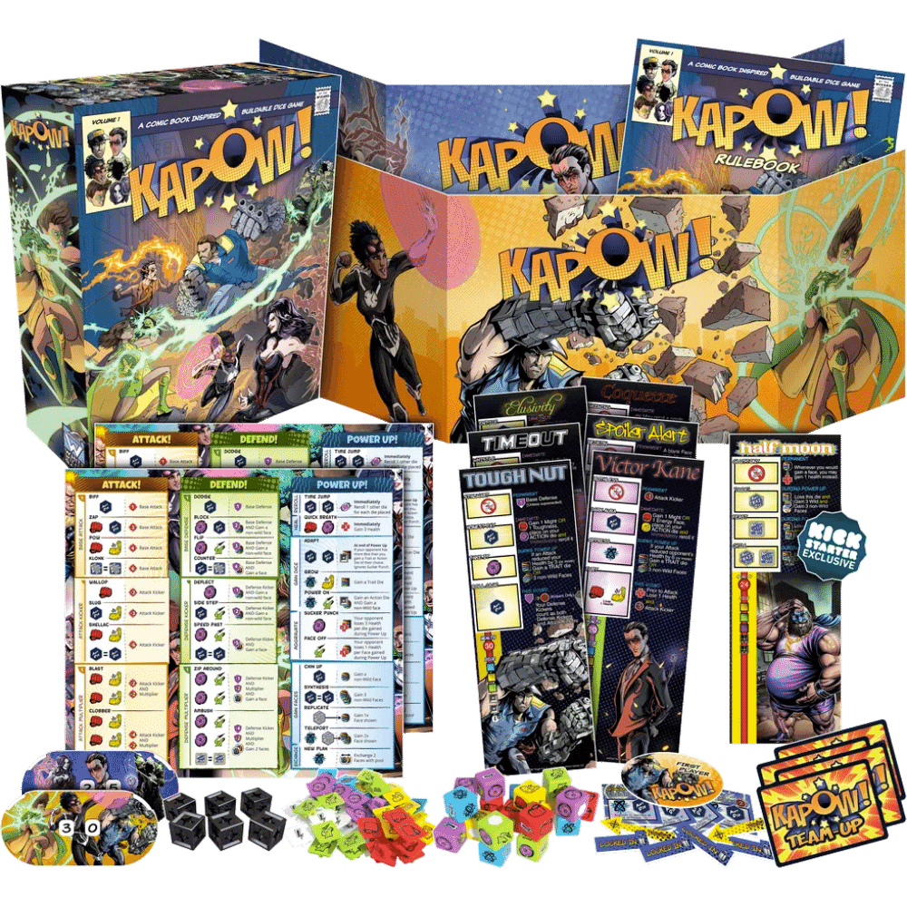 KAPOW! Volume 1 contains six supers: Tough Nut, Elusivity, and Time Out are the heroes, while Victor Kane, Coquette, and Spoiler Alert are the villains. This set can be combined with KAPOW! Volume 2 to mix and match the characters or have up to four players in one game.
