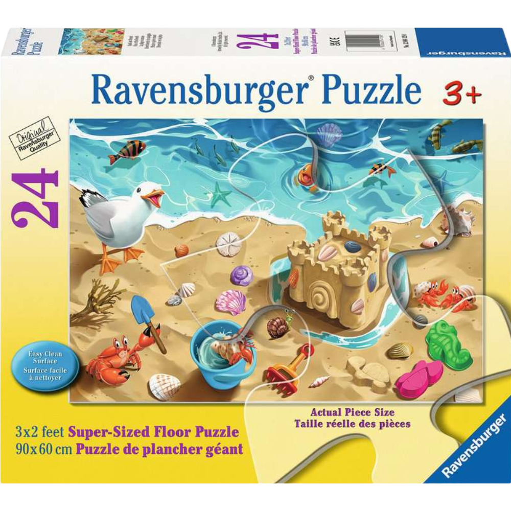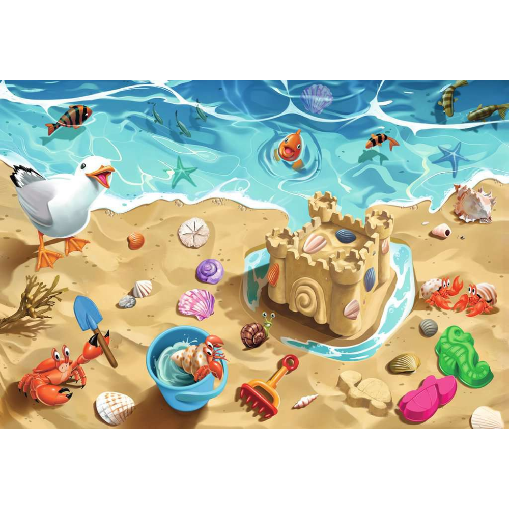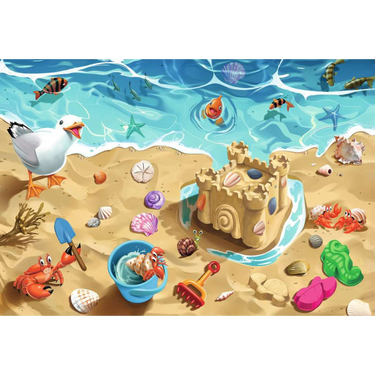 A friendly seagull perches on the sand with various colourful shells scattered around. A brightly coloured bucket is ready for collecting the shells as cute little crabs scuttle across the sand.