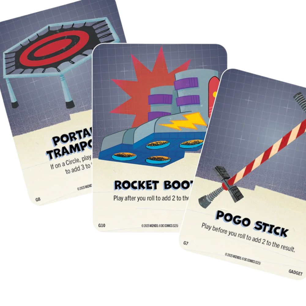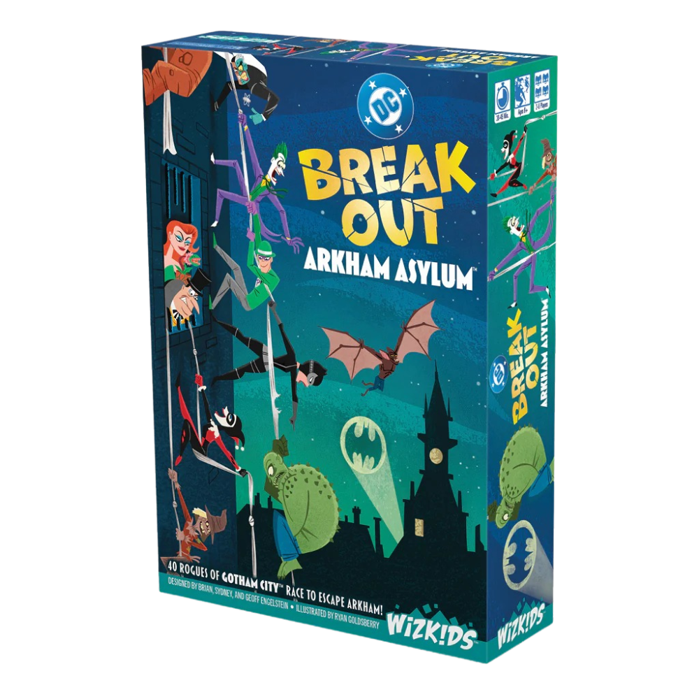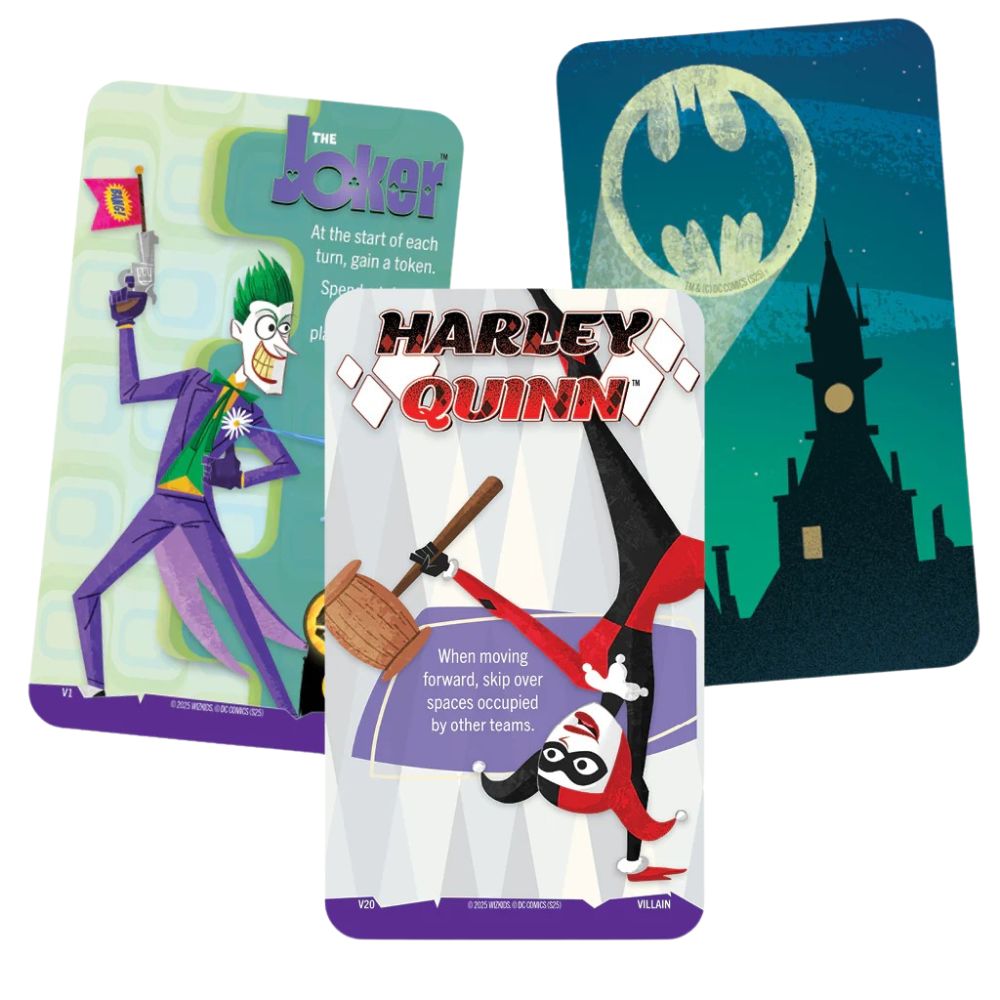 In DC Breakout: Arkham Asylum, each player gets five villains from Batman's history, then chooses two teams of two villains, with each team competing in one of two races. Hundreds of possible duos exist, with each villain having a unique power that can be supplemented with gadgets to gain the upper hand over your rivals. Whoever wins the second race wins the entire game.
