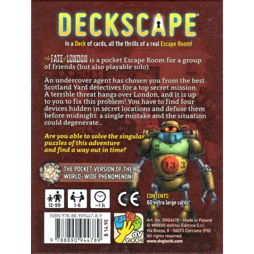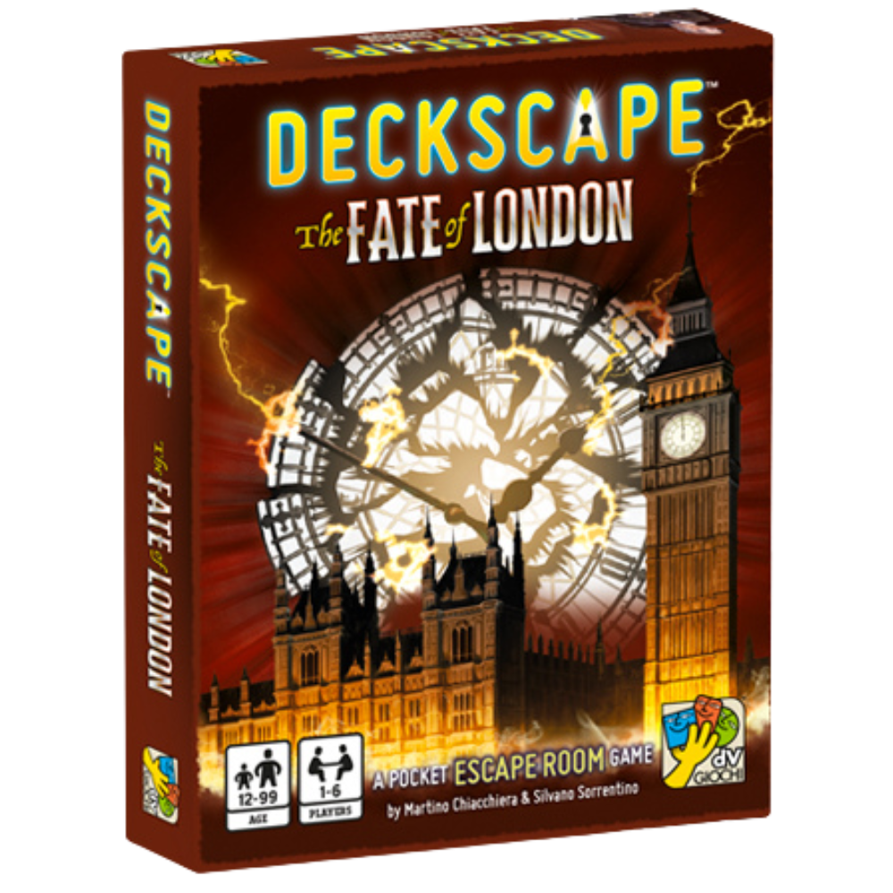 Deckscape: The Fate of London is the second title in a series of cooperative games inspired by real escape rooms in which a group of people is "trapped" inside a room full of puzzles and odd items. The goal of the game is to solve puzzles, understand the plot of the story, and make intelligent use of the items provided in order to exit from the room as quickly as possible.