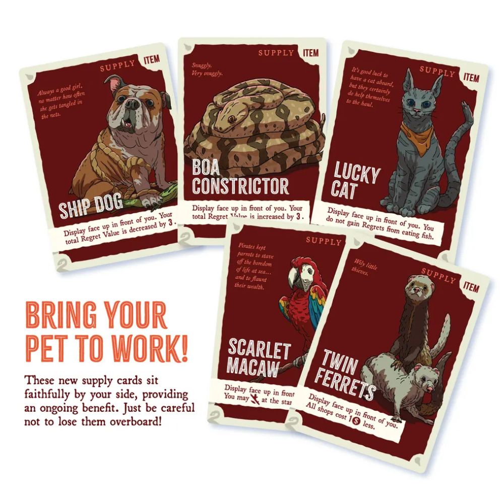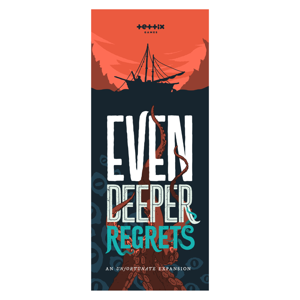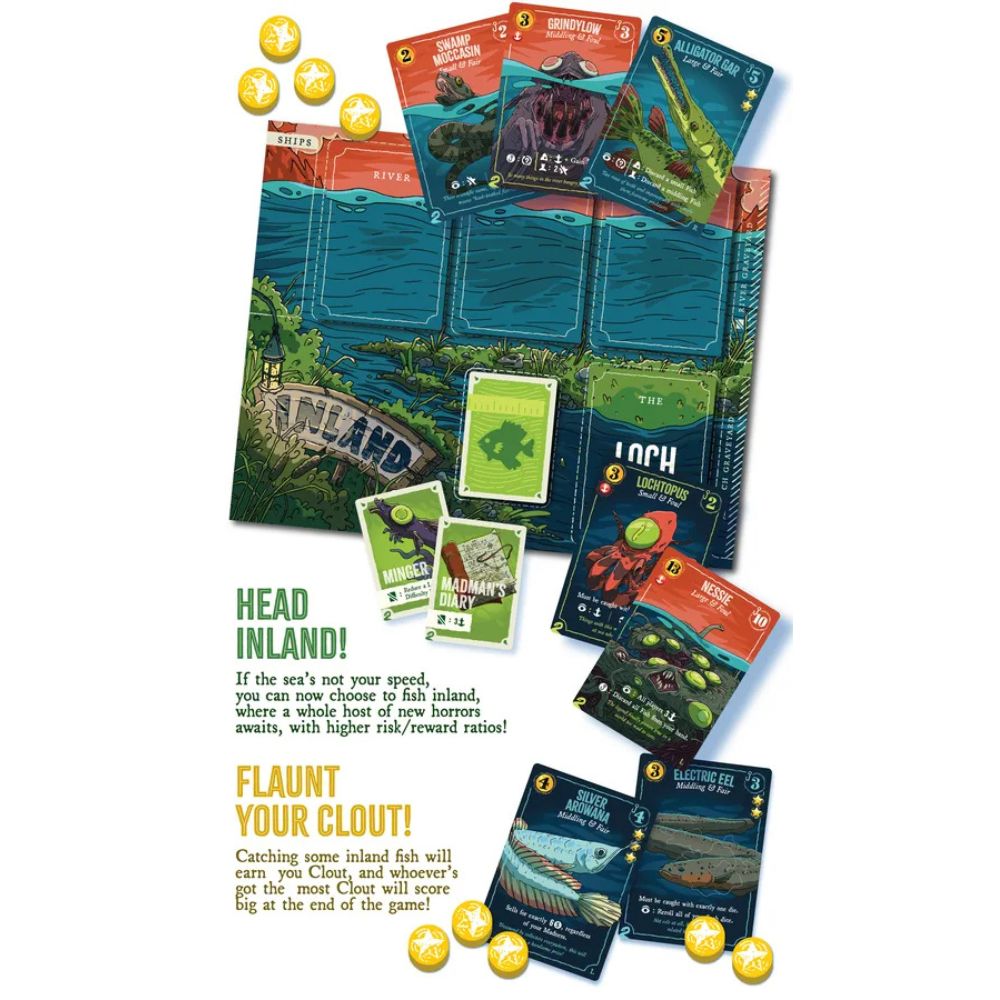 Gameplay in Even Deeper Regrets is the same as in the base game with one major exception: you can now choose to start each day Inland in addition to Sea and Port! Inland, you can fish from three River shoals or one Loch shoal, both of which have a higher risk/reward ratio than the Sea. 74 new fish and 25 dinks await inland!