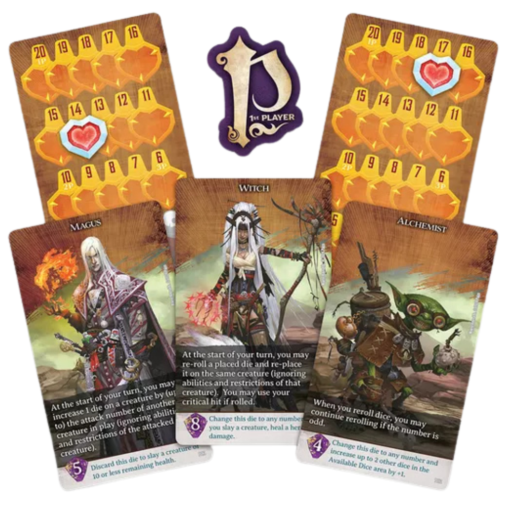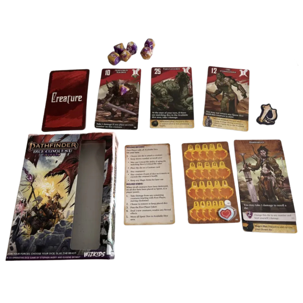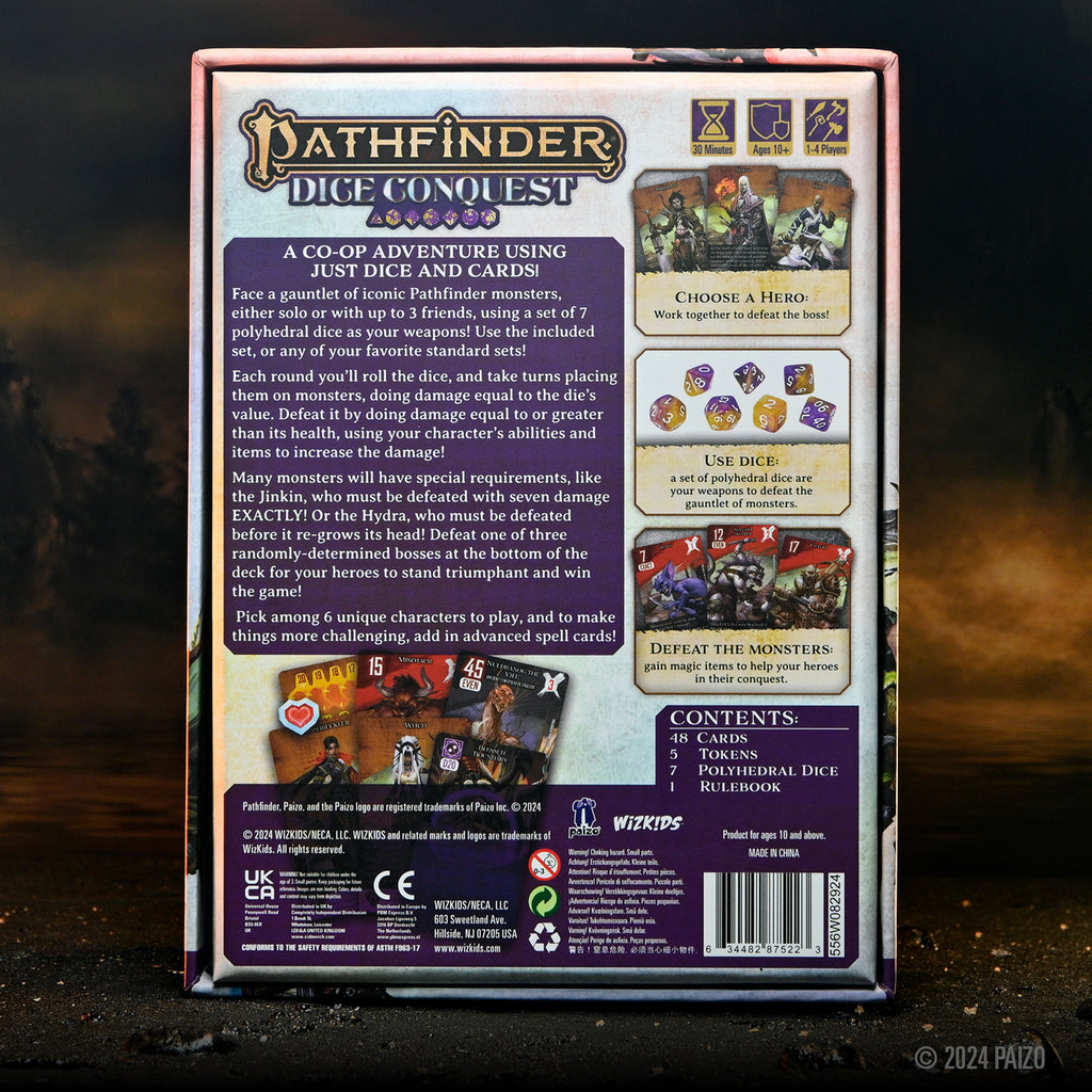 Face a gauntlet of iconic Pathfinder monsters, solo or with up to 3 friends, using a set of 7 polyhedral dice as your weapons! Use the included set or any of your favorite standard sets! It’s perfect for travel, as all you need is dice and the deck of cards!