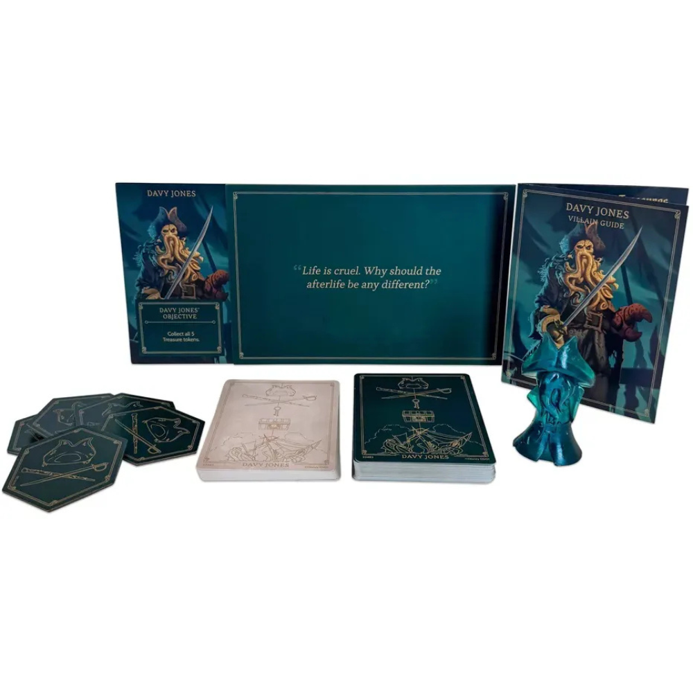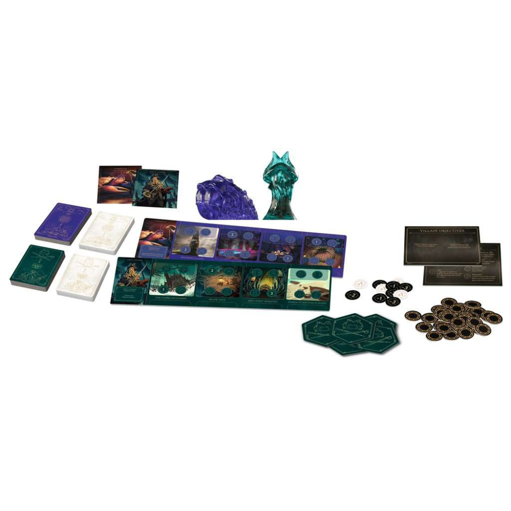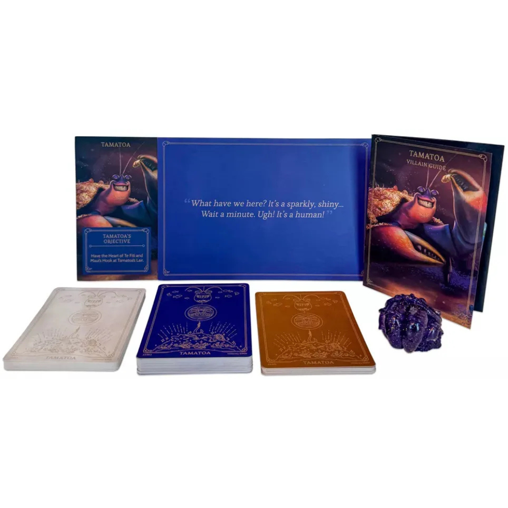 In Villainous: Treacherous Tides, each player takes control of one of two Disney characters, each a villain in a different Disney movie, specifically Davy Jones (The Pirates of the Caribbean) and Tamatoa (Moana). Each player has their own villain deck, fate deck, player board, and 3D character.