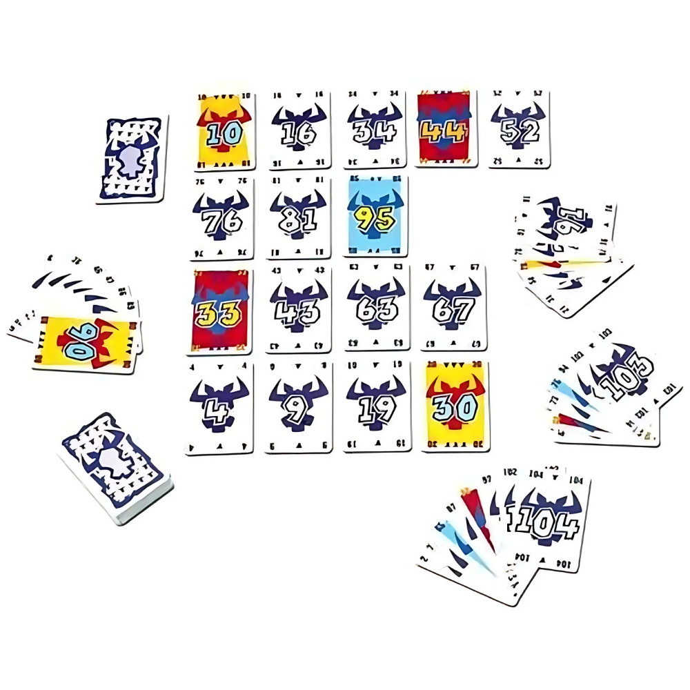 To play the game, you shuffle the 104 number cards, lay out four cards face-up to start the four rows, then deal ten cards to each player. Each turn, players simultaneously choose and reveal a card from their hand, then add the cards to the rows, with cards being placed in ascending order based on their number; specifically, each card is placed in the row that ends with the highest number that's below the card's number. When the sixth card is placed in a row, the owner of that card claims the other five cards and the sixth card becomes the first card in a new row.