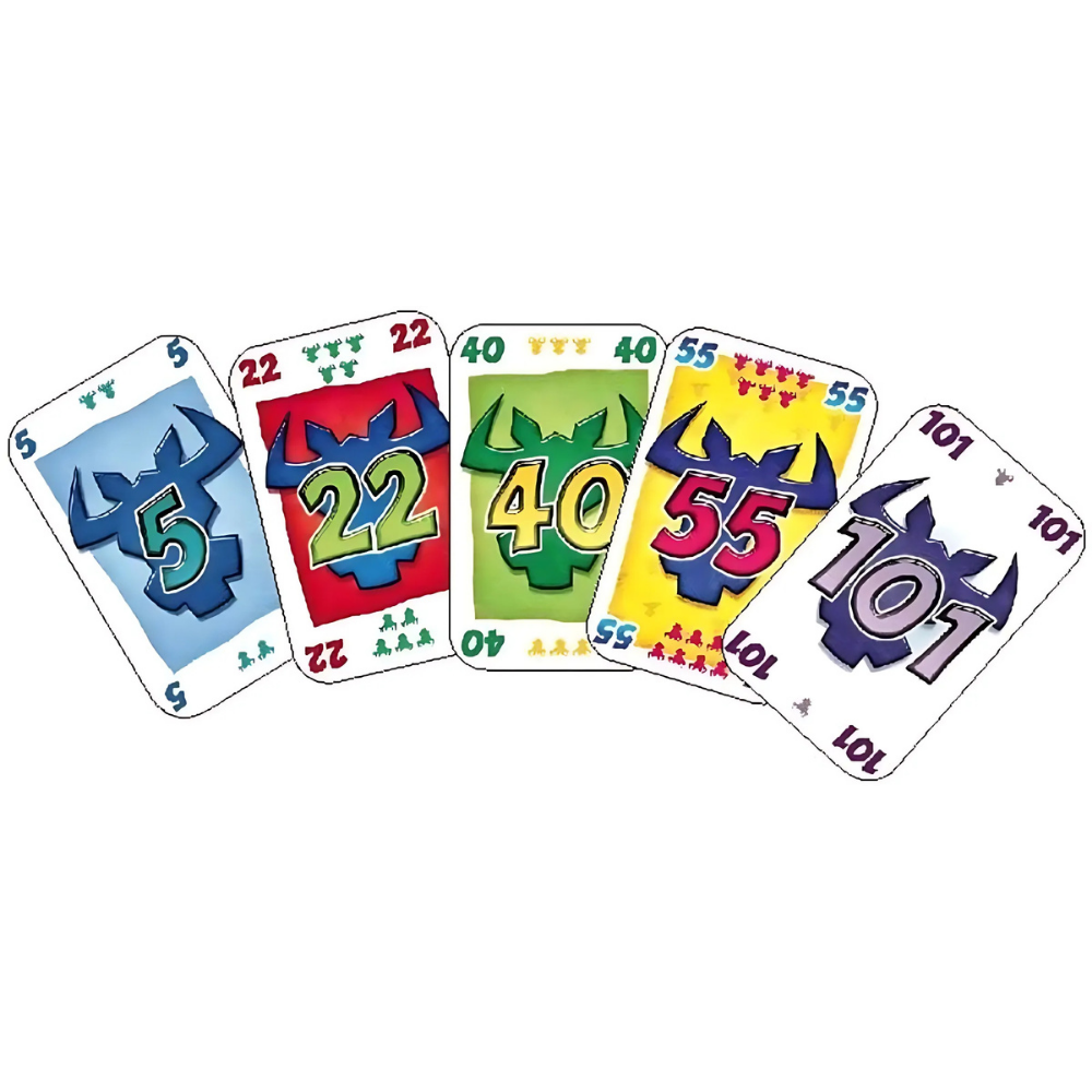 In addition to a number from 1 to 104, each card has a point value. After finishing ten rounds, players tally their score and see whether the game ends. (Category 5 ends when a player has a score greater than 74, for example, while 6 nimmt! ends when someone tops 66.) When this happens, the player with the fewest points wins!