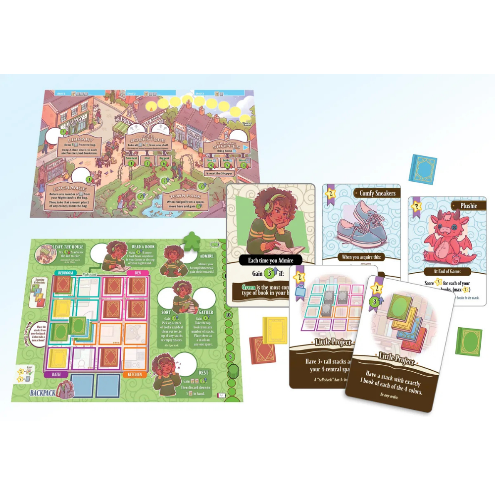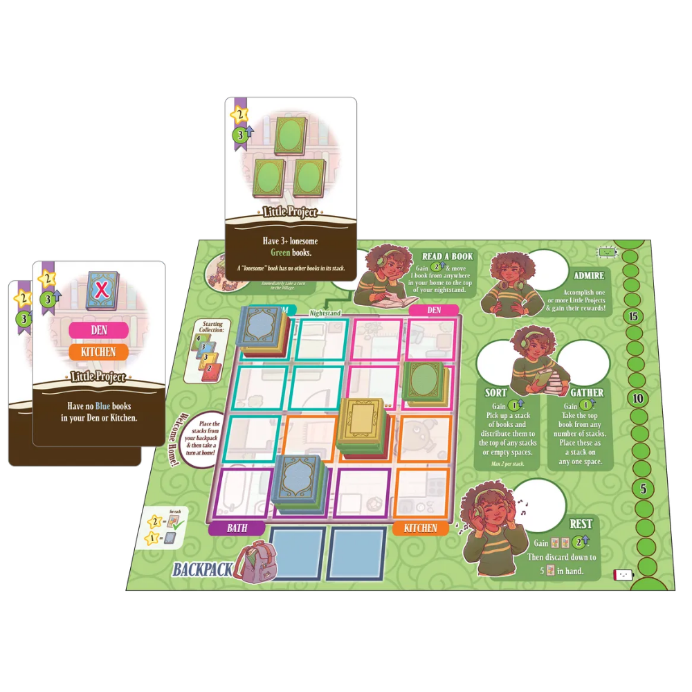 A Place for All My Books is a puzzley book gathering, sorting, and organising game in which players arrange stacks of books in different rooms of their apartment as personal projects. When done, they can admire their accomplishments and gain their rewards – not least of which is renewed energy, which they can then spend to head out into the village...to pick up more books!
