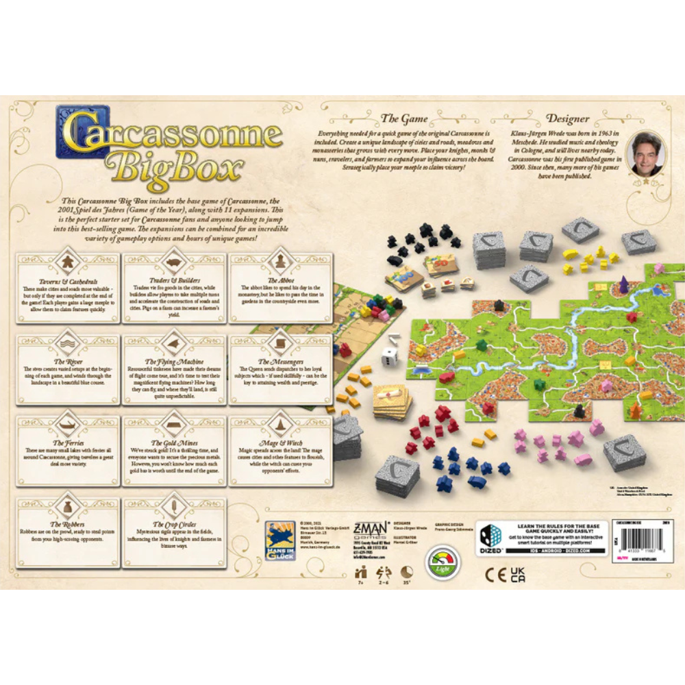 The Carcassonne Big Box is the perfect starter set for everyone who finally wants to get to know Carcassonne in all its diversity and of course also for all Carcassonne fans. In addition to the basic game and the 1st expansion "Inns and Cathedrals" and the 2nd expansion "Traders and Builders", it also contains the 6 long-awaited mini expansions: "The Flying Machines", "The Dispatches", "The Ferries", "The Gold Mines", "Magicians and Witches" and "The Robbers". Of course, the Big Box also contains the mini expansion "The Crop Circles" but also "The Abbot" and "The River".