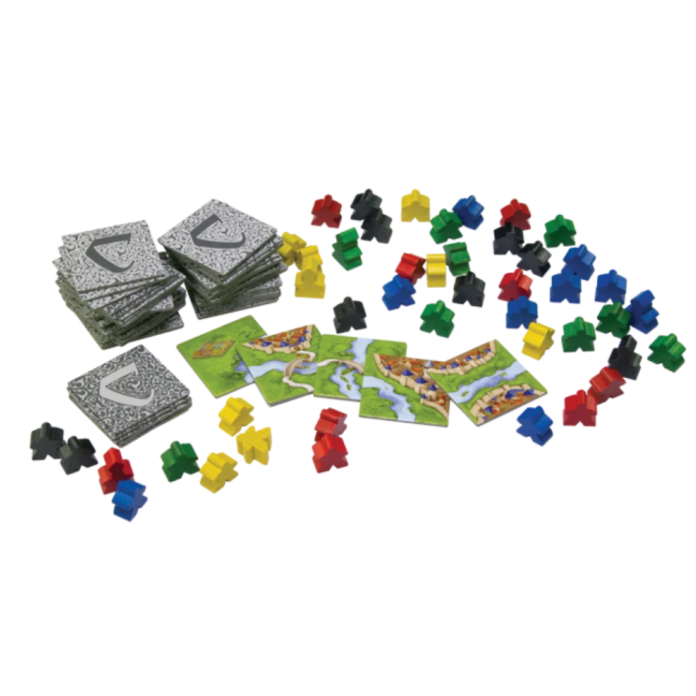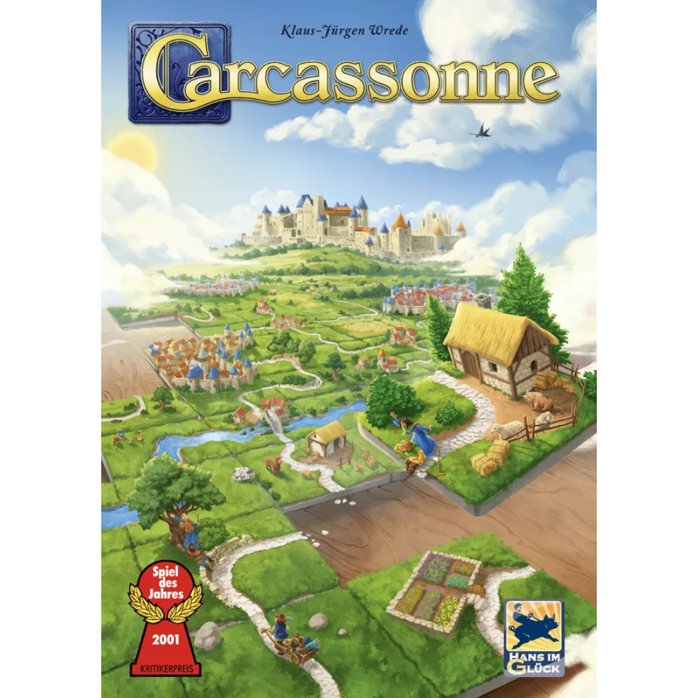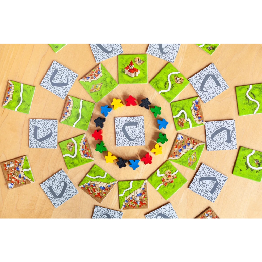 Carcassonne is a tile-placement game in which the players draw and place a tile with a piece of southern French landscape on it. The tile might feature a city, a road, a cloister, grassland or some combination thereof, and it must be placed adjacent to tiles that have already been played, in such a way that cities are connected to cities, roads to roads, etcetera. Having placed a tile, the player can then decide to place one of his meeples on one of the areas on it: on the city as a knight, on the road as a robber, on a cloister as a monk, or on the grass as a farmer. When that area is complete, that meeple scores points for its owner.