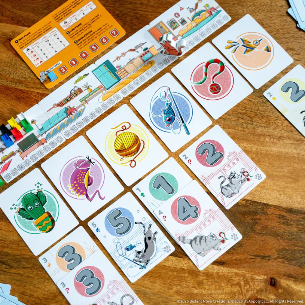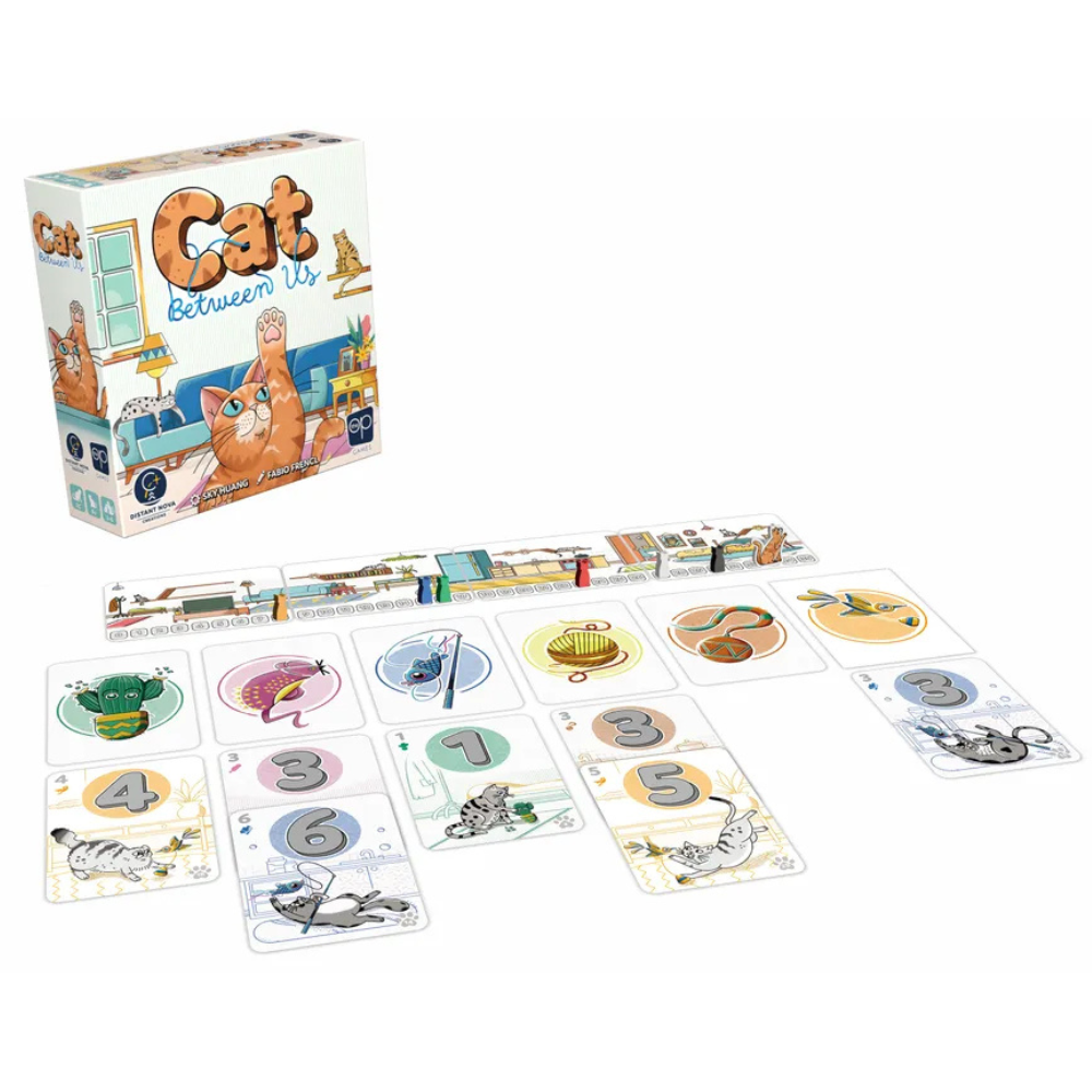 Each round in Cat Between Us, you first draw a card from the deck, then place the cat token on the numbered space on the track matching the tiny number on the card. Shuffle the deck, then deal all players their current hand size.