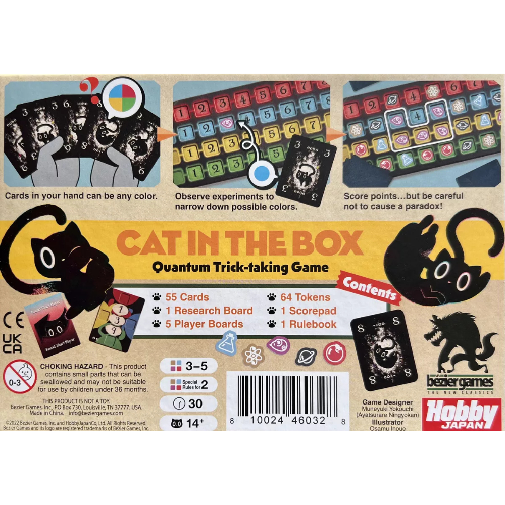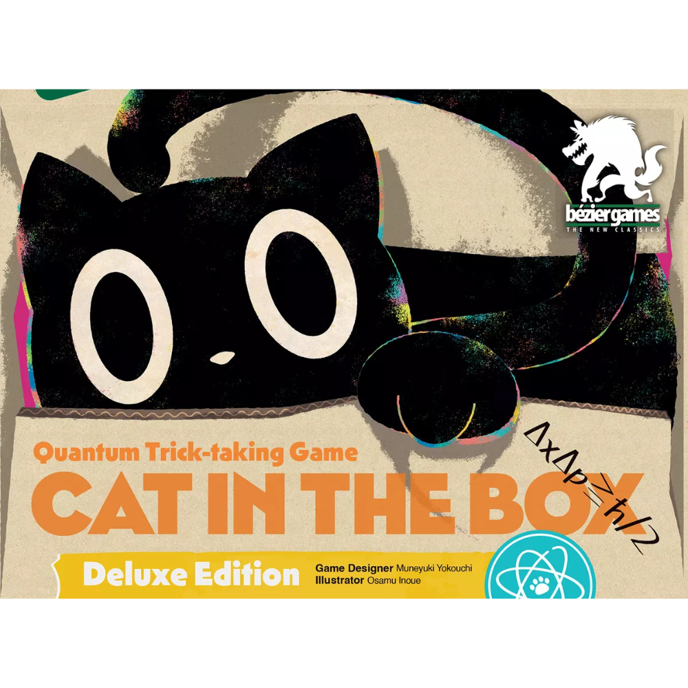 Cat in the Box: Deluxe Edition is the quintessential quantum trick-taking card game for 2 - 5 cool cats, where your card’s color isn’t defined until you play it! Hypothesize how many tricks you will win, and record your bid. Place tokens on the community research board as you play your hand, and connect large groups of tokens to score even more points. Plan your tricks carefully as you cannot claim the color of a card with the same number that has already been declared. Doing so would be pawsitively catastrophic as you have just created a paradox!