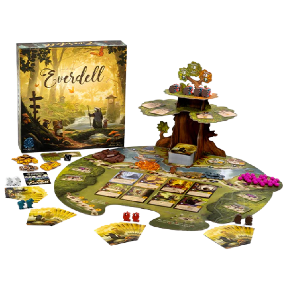 Within the charming valley of Everdell, beneath the boughs of towering trees, among meandering streams and mossy hollows, a civilization of forest critters is thriving and expanding. From Everfrost to Bellsong, many a year have come and gone, but the time has come for new territories to be settled and new cities established. You will be the leader of a group of critters intent on just such a task. There are buildings to construct, lively characters to meet, events to host—you have a busy year ahead of yourself. Will the sun shine brightest on your city before the winter moon rises?