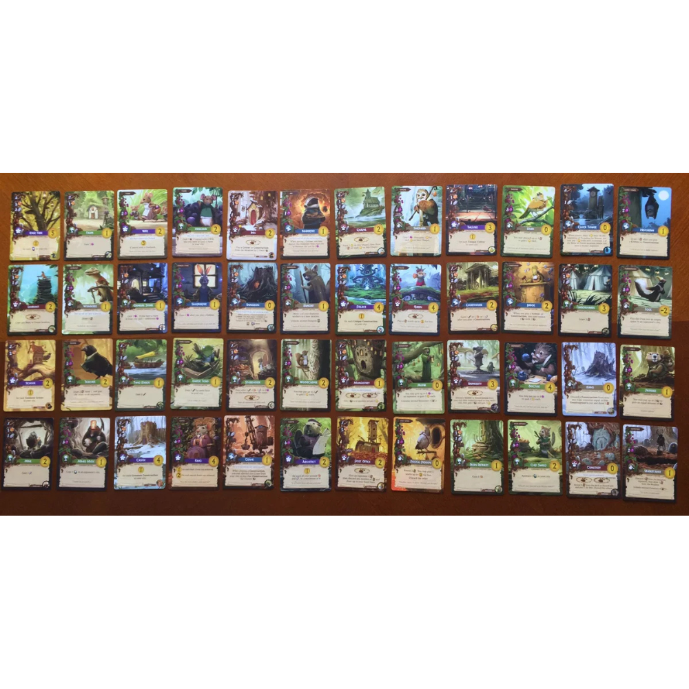 b) Play a Card: Each player is building and populating a city; a tableau of up to 15 Construction and Critter cards. There are five types of cards: Travelers, Production, Destination, Governance, and Prosperity. Cards generate resources (twigs, resin, pebbles, and berries), grant abilities, and ultimately score points. The interactions of the cards reveal numerous strategies and a near infinite variety of working cities.
