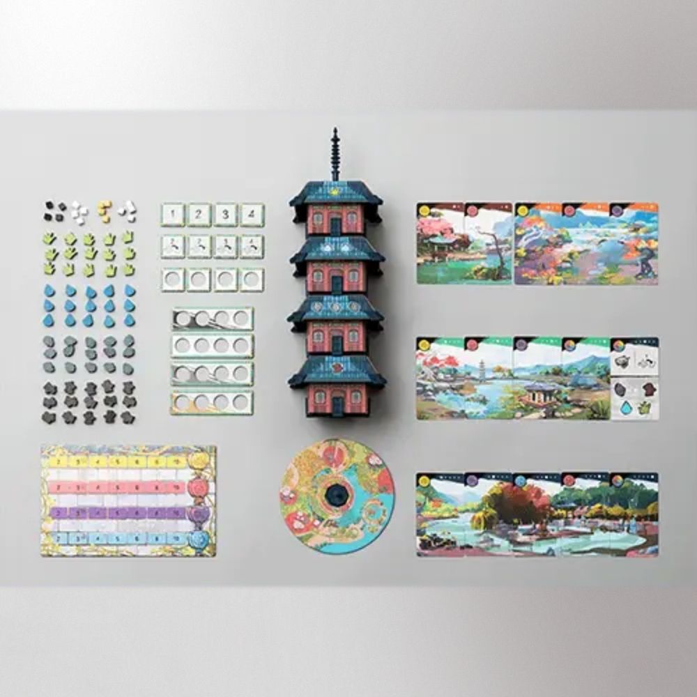 Players can finish panoramas by first laying groundwork cards, acquiring resources by turning the 3D pagoda, and allocating those resources to satisfy the requirements of each groundwork card. Once satisfied, a groundwork card becomes a landscape card. Multiple landscape cards laid in the correct order create a panorama. Each God has their own satisfaction meter which expresses their goodwill towards the gardens and their builders. Players try to please the Gods by completing landscape cards and finishing panoramas.